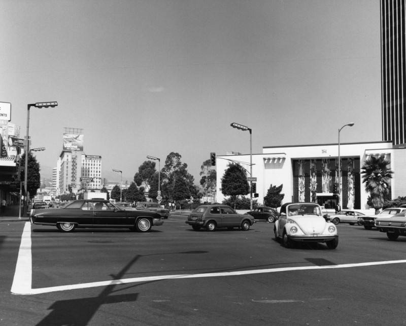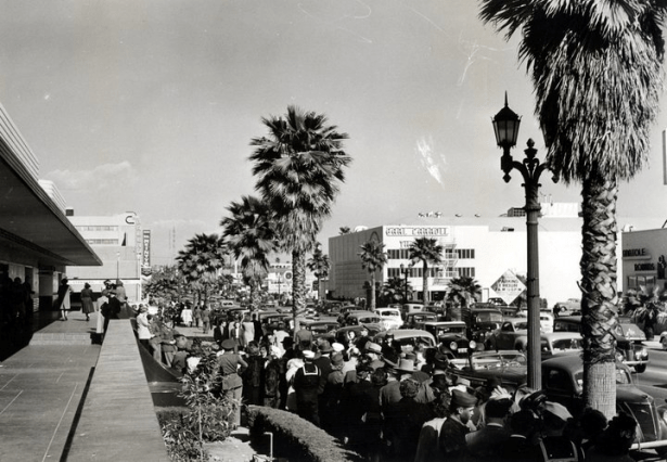 Circa 1937. A used car lot occupied the Vine Street side of the former Famous Players-Lasky studio between Sunset and Selma. Carpenter’s drive-in sandwich stand is at the northeast corner of Sunset & Vine. Huntington Library digital.