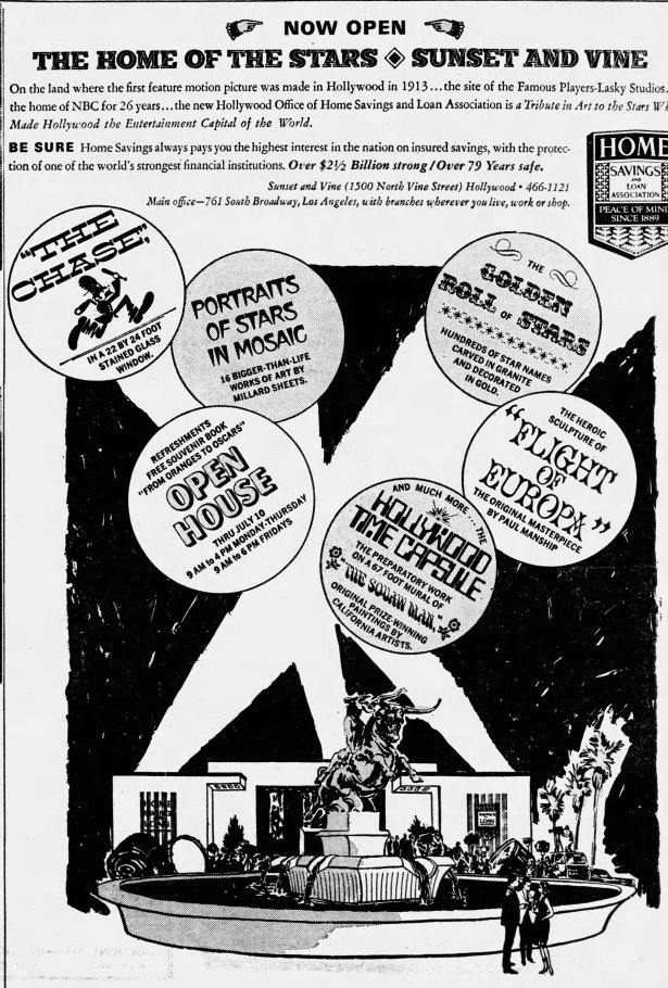 The property sat vacant for almost 4 years. Home Savings & Loan ultimately built its own headquarters on the site. The 2-story structure, addressed as 1500 N. Vine, opened in June 1968. In recognition of the site’s importance in Hollywood history, it features a mosaic mural, “The Golden Role of Stars” by Millard Sheets, and a stained glass window by Susan Hertel depicting famous chase scenes. Out front is a fountain with a 1920s sculpture by Paul Manship, the Flight of Europa. The building is currently a Chase Bank.