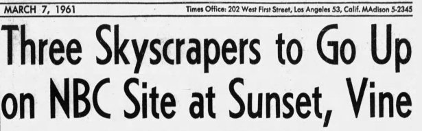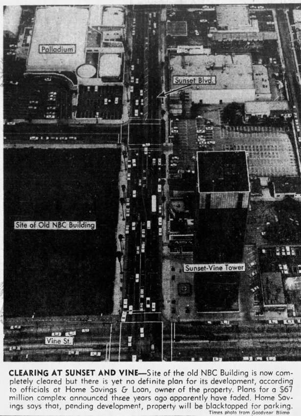 NBC did depart in 1963 as planned and begininning in May 1964, the 26 year-old radion/television studio was demolished. But the skyscraper development never materialized and the property’s new owner, Home Savings and Loan, had no plans for developing the vacant site.