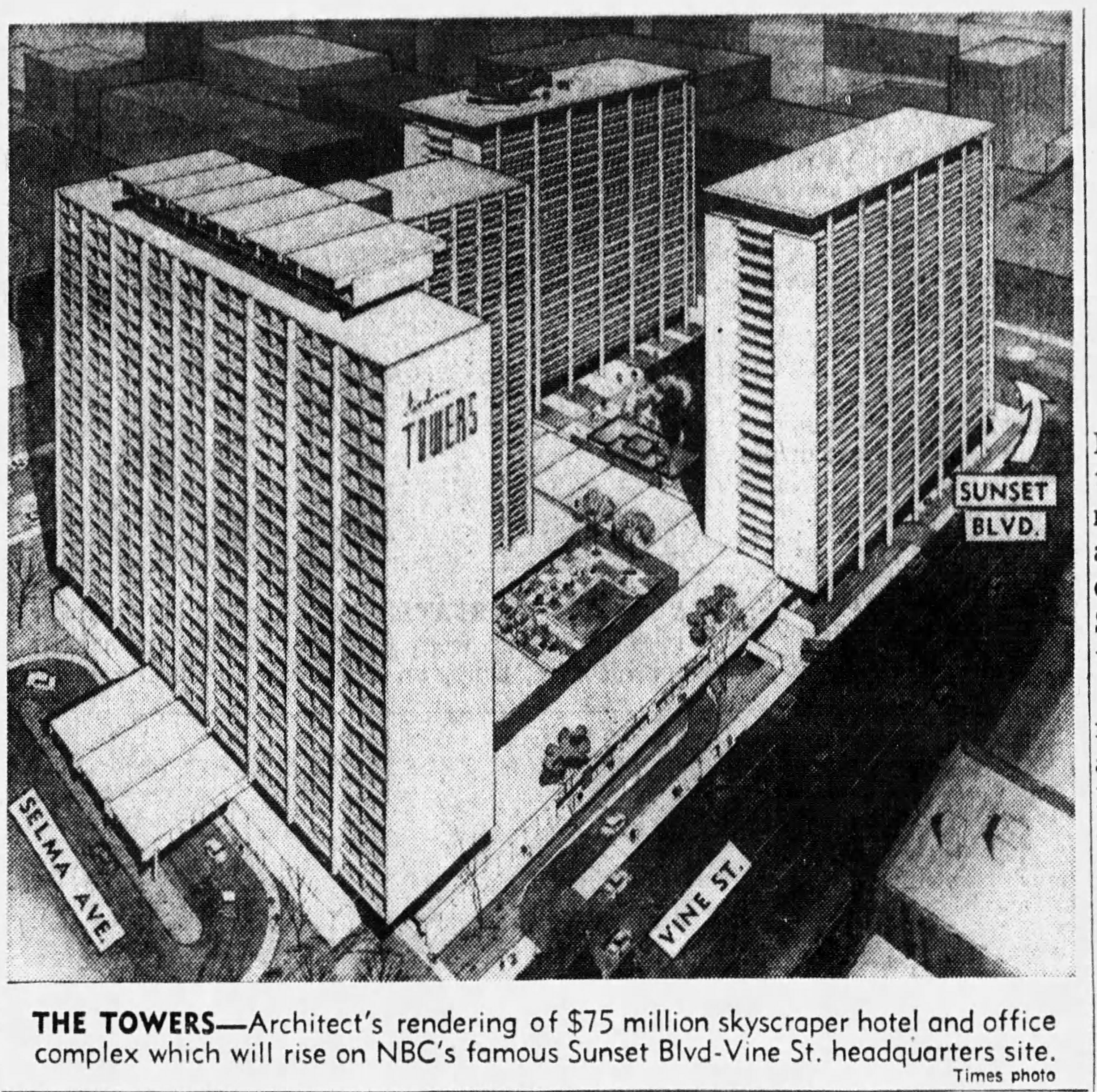 By the fall of 1951, NBC was building its own television studio in Burbank, which opened in October 1952. An addition specifically for color television, called Color City, was dedicated in March 1955. NBC still had plenty of use for its Sunset and Vine studio. In 1961, however, the studio announced that by 1963 it would consolidate its operations in Burbank and began shopping the Sunset and Vine property to potential buyers. In March 1961, NBC reported that it was negotiating with developer Lionel Hayes Uhlmann to sell the parcel for $3.5 million. The developer was proposing to build a 3-skyscraper hotel-office complex on the site after NBC departed in 1963.