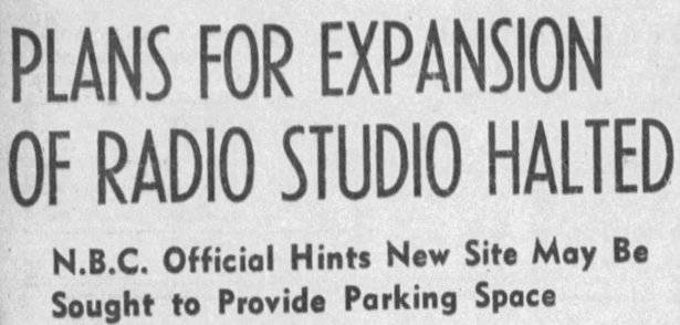 The paint at Melrose Avenue had barely dried when already there was talk of adding even more space. On February 10, 1937, expansion effort was abruptly halted, however, by network president Lenox N. Lohr when he realized there was a serious problem with this location: not enough parking places.