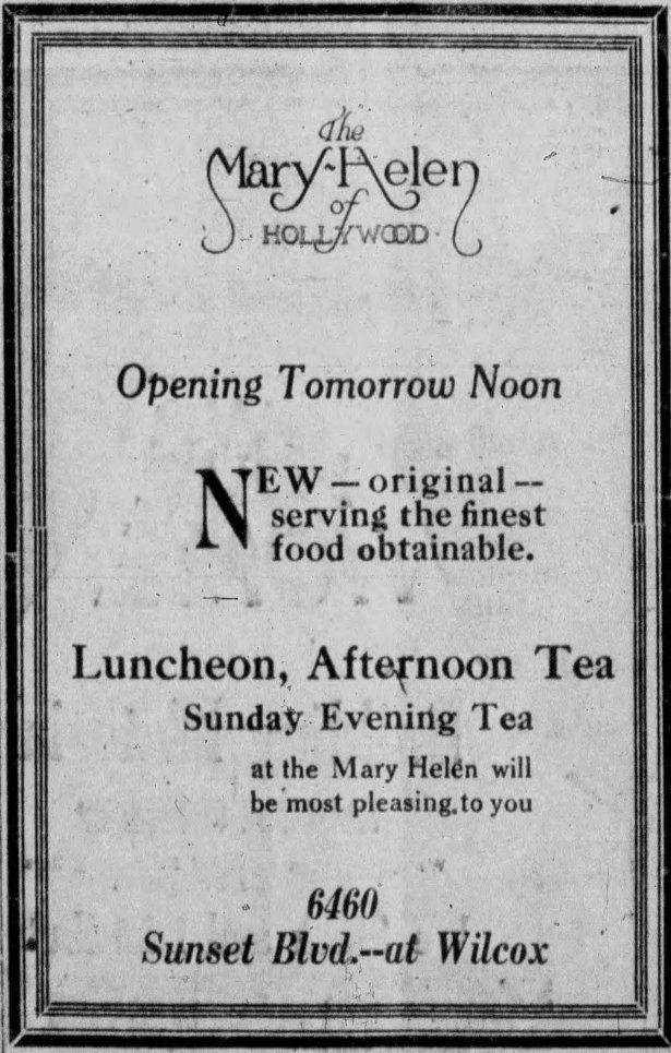 Mary Helen Kemp opened her first Sunset Boulevard tea room at the southwest corner of Sunset and Wilson on September 26, 1922.