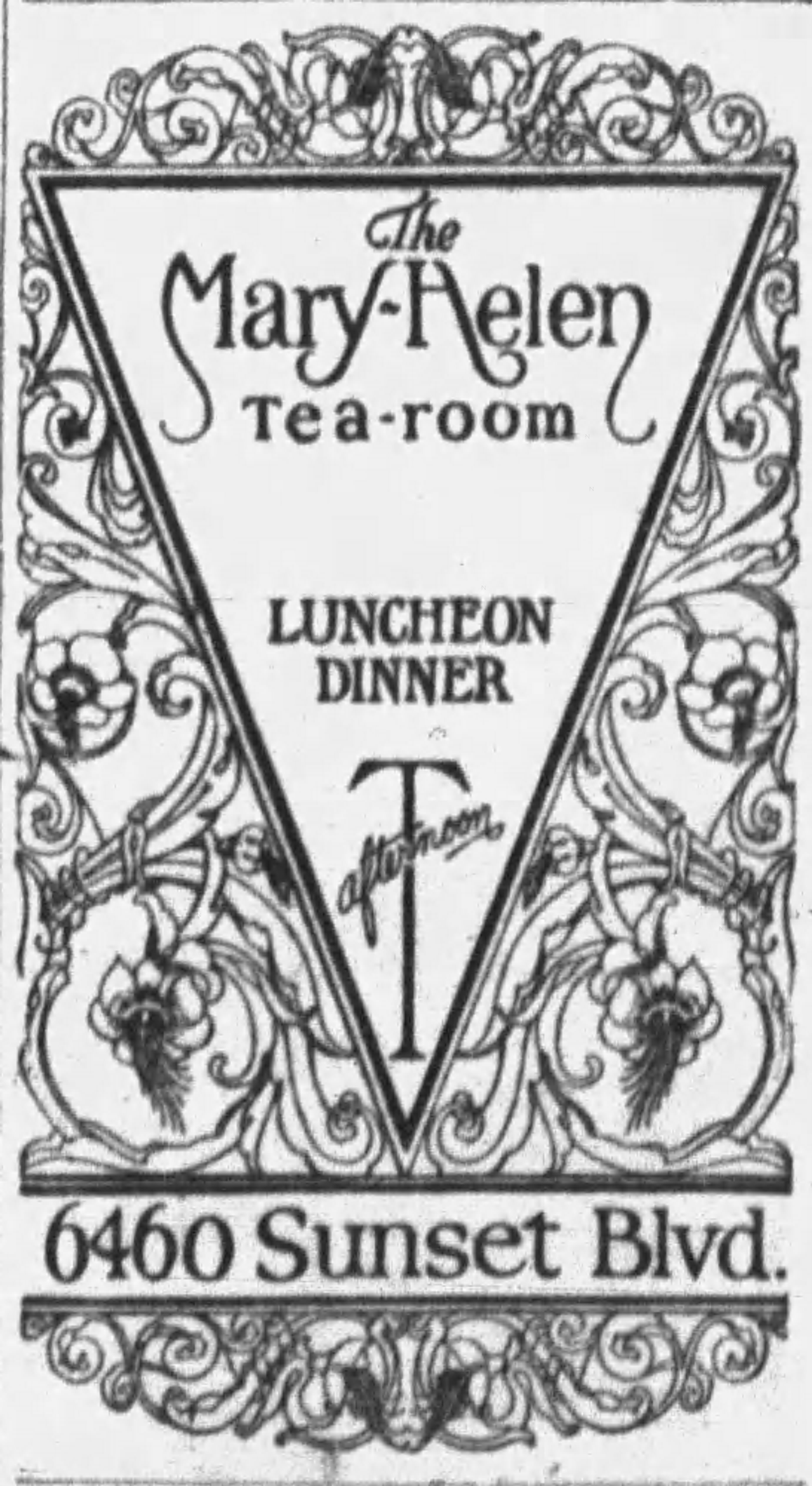 Mary Helen Kemp opened her first Sunset Boulevard tea room at the southwest corner of Sunset and Wilson on September 26, 1922.