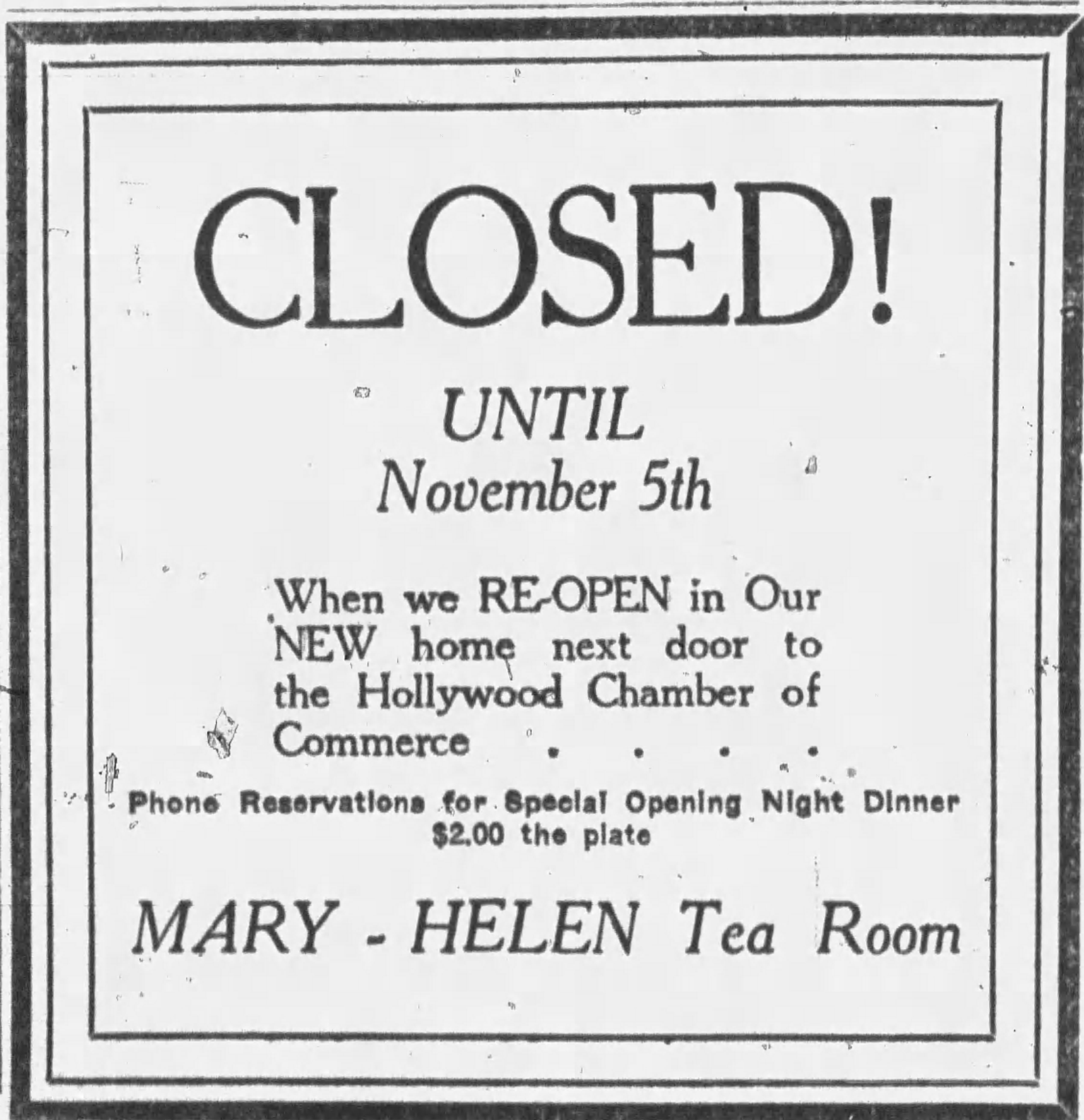 At the end of October, 1927, Kemp closed the Mary-Helen at 6460 Sunset in order to prepare for a grand re-opening down the street at her new location at 6530 Sunset in the recently built Fred Thompson building.