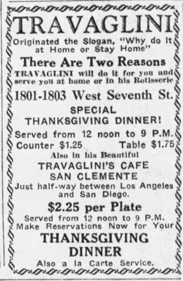 Travaglini continued to operate his namesake cafe in San Clemente, which opened in 1927, and a new cafe in Laguna Beach established in 1931.