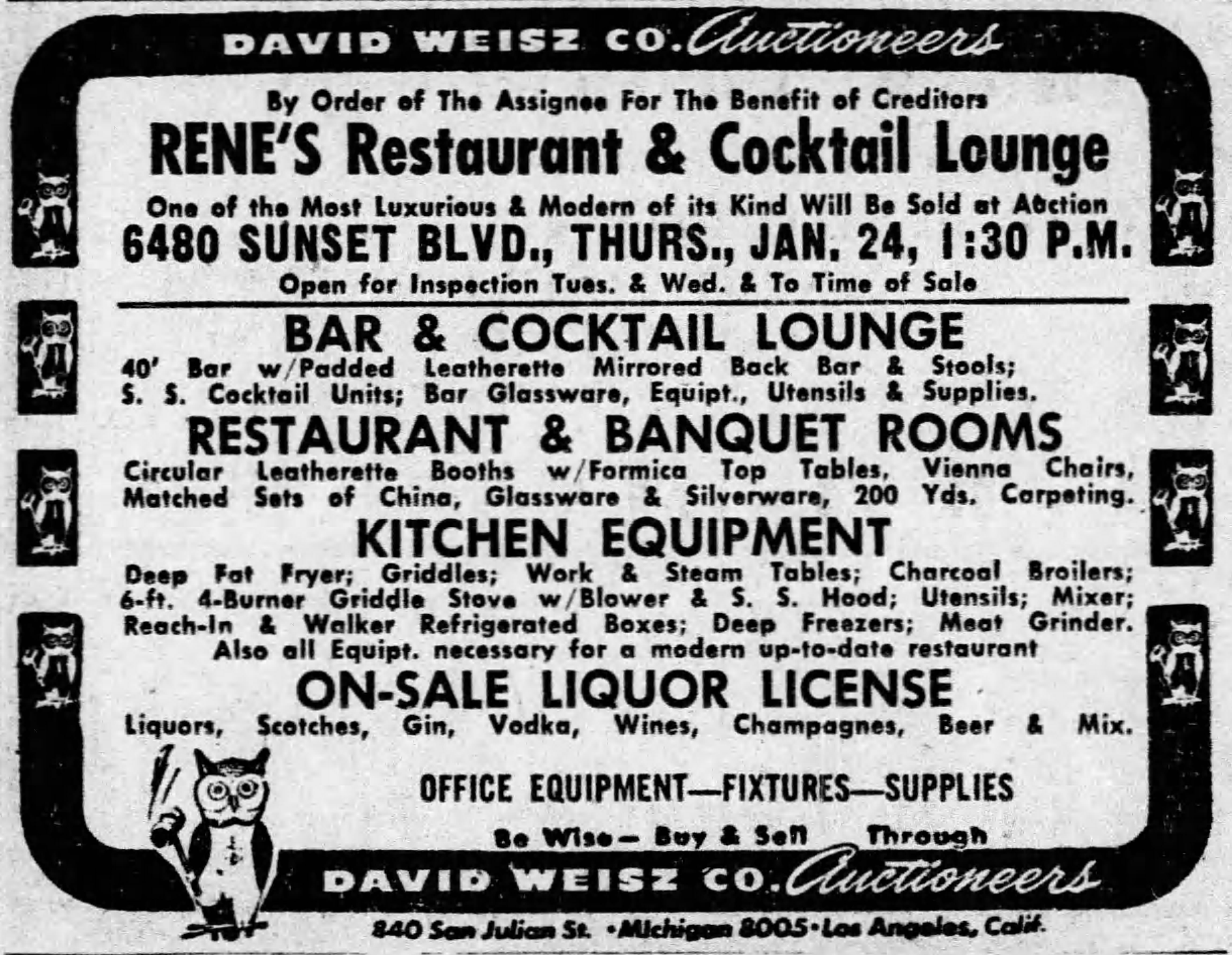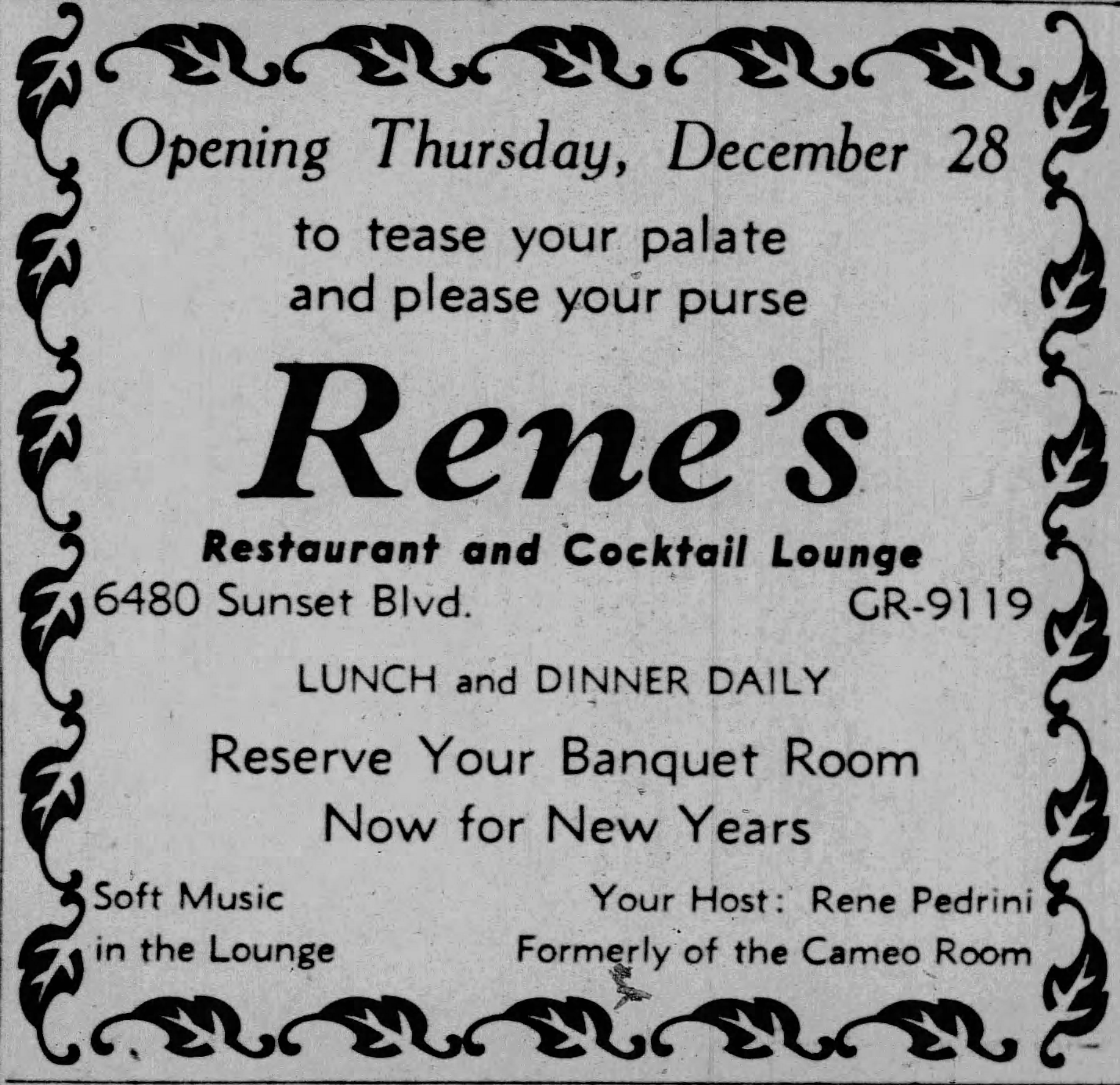 On December 28, 1950 La Maria became Rene’s, an all-you-can-eat buffet, run by Rene Pedrini, lately of the Cameo Room down the street at Sunset and Normandie.
