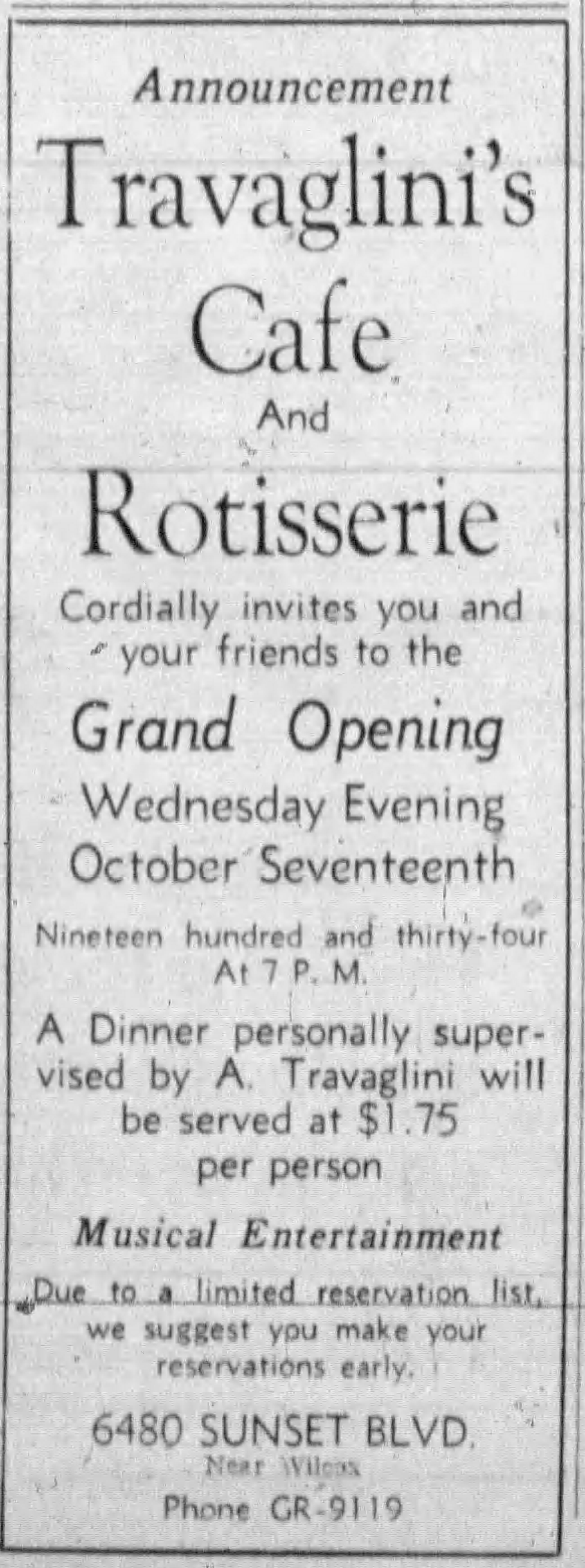 On October 17, 1934, 6480 Sunset had its grand opening as Travaglini’s Cafe and Rotisserie.