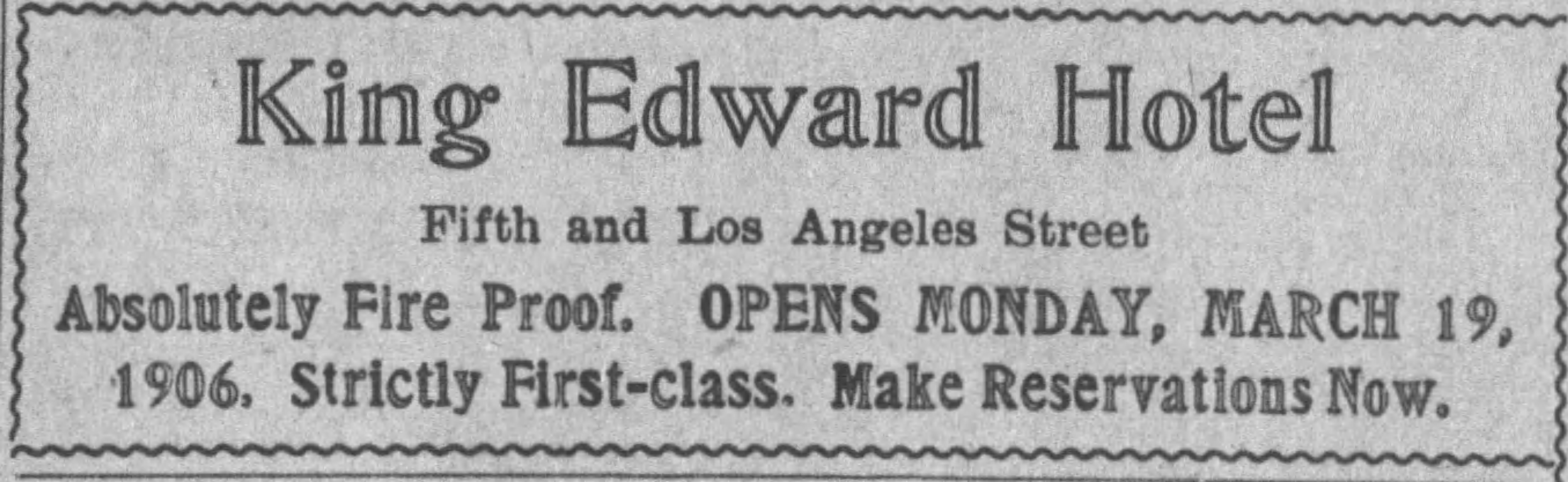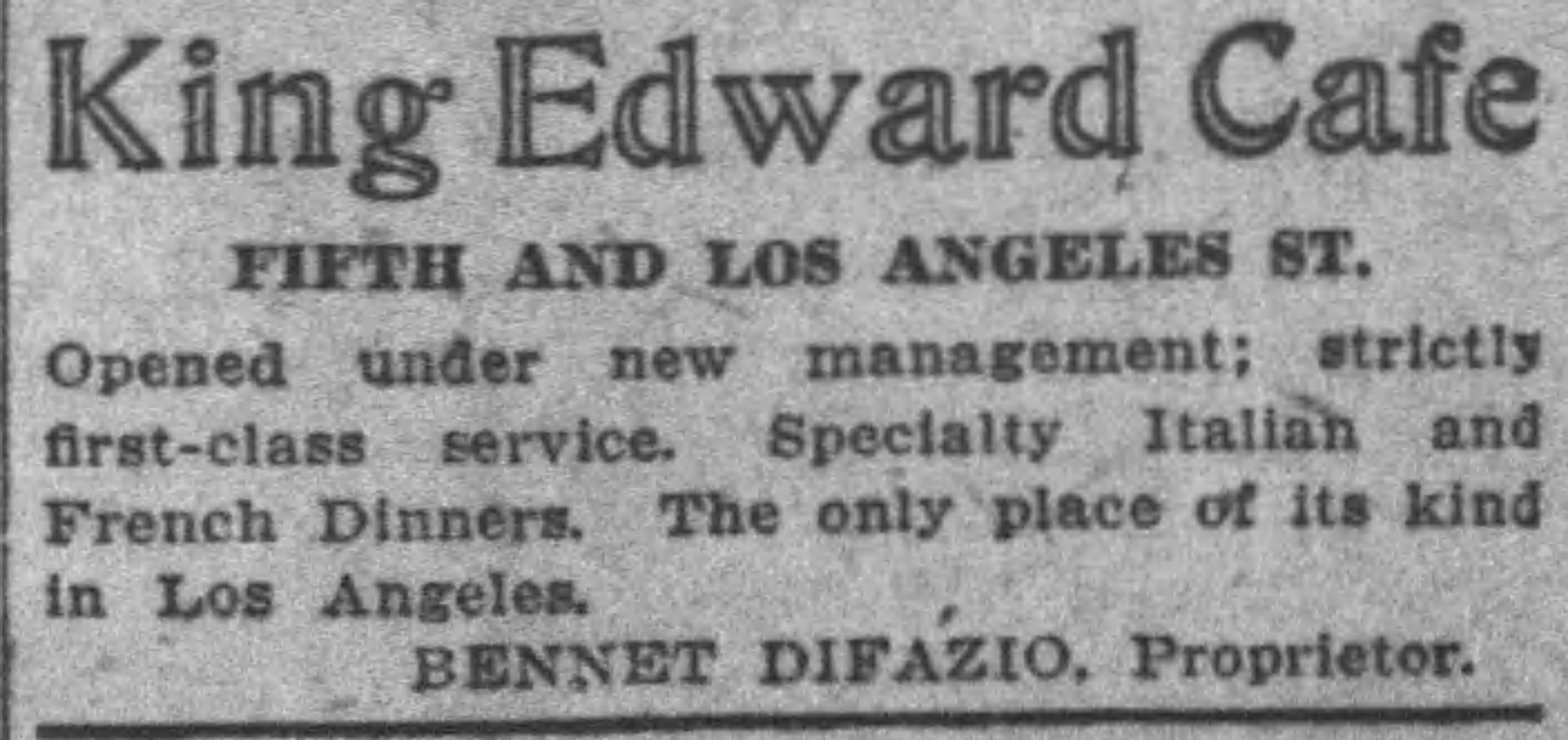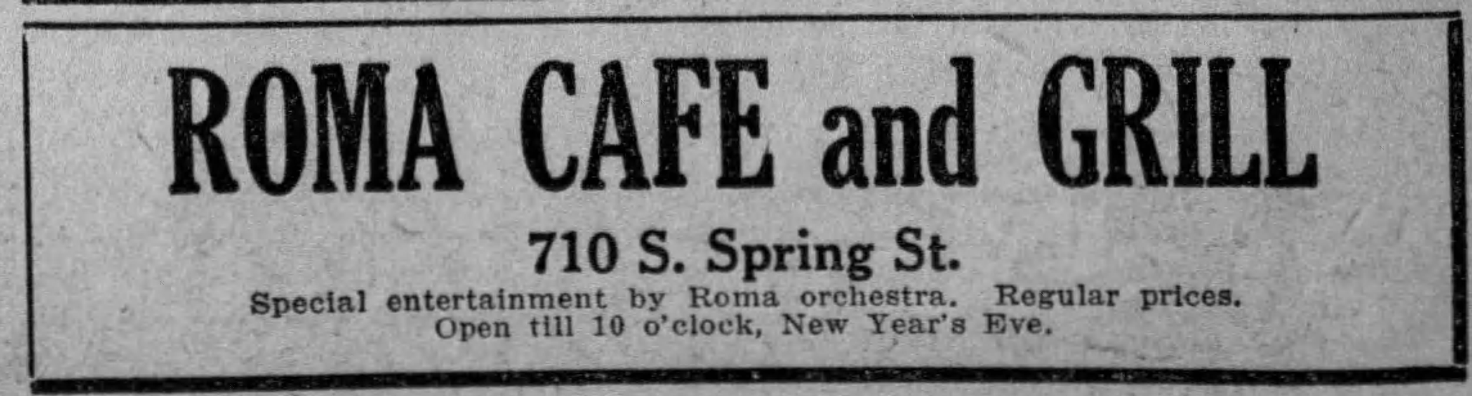 Gus Cline operated the cafe at the Kind Edward from 1908 to 1909, serving German and Hungarian dishes. In late 1909 it reopened as the King Edward Cafe with Italian and French dinners. In 1910, A. Travaglini Co. and Frank E. Zucca were running the former King Edward Cafe at 117-19 E. Fifth St., renamed the Roma Cafe, serving Italian and French dinners. A. Travaglini later moved the cafe from the King Edward to 710 S. Spring St. In July 1914, he had the space enlarged and reopened the Roma next door at 712 S. Spring.