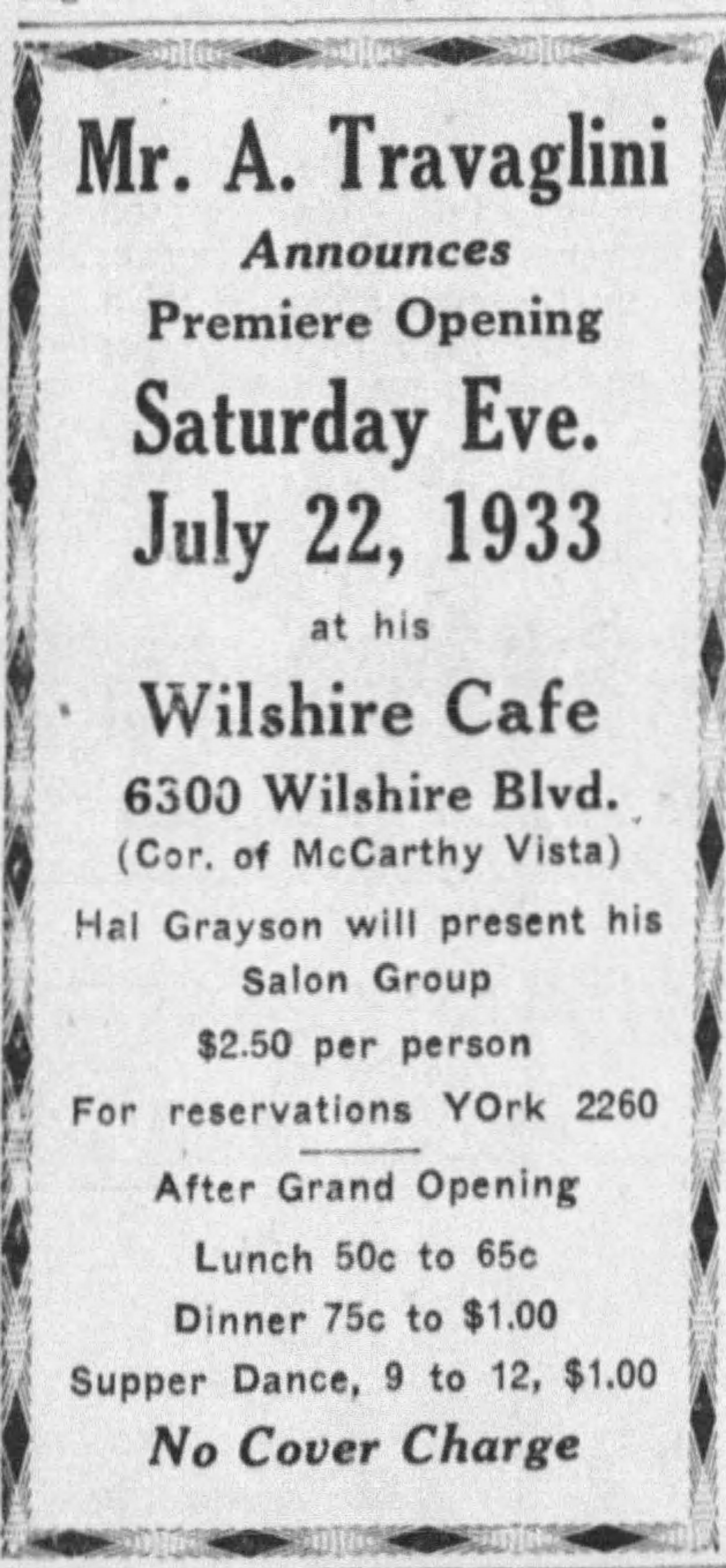 After a two year absence from Los Angeles, A. Travaglini returned, opening at 6300 Wilshire Boulevard on July 19. 1933.