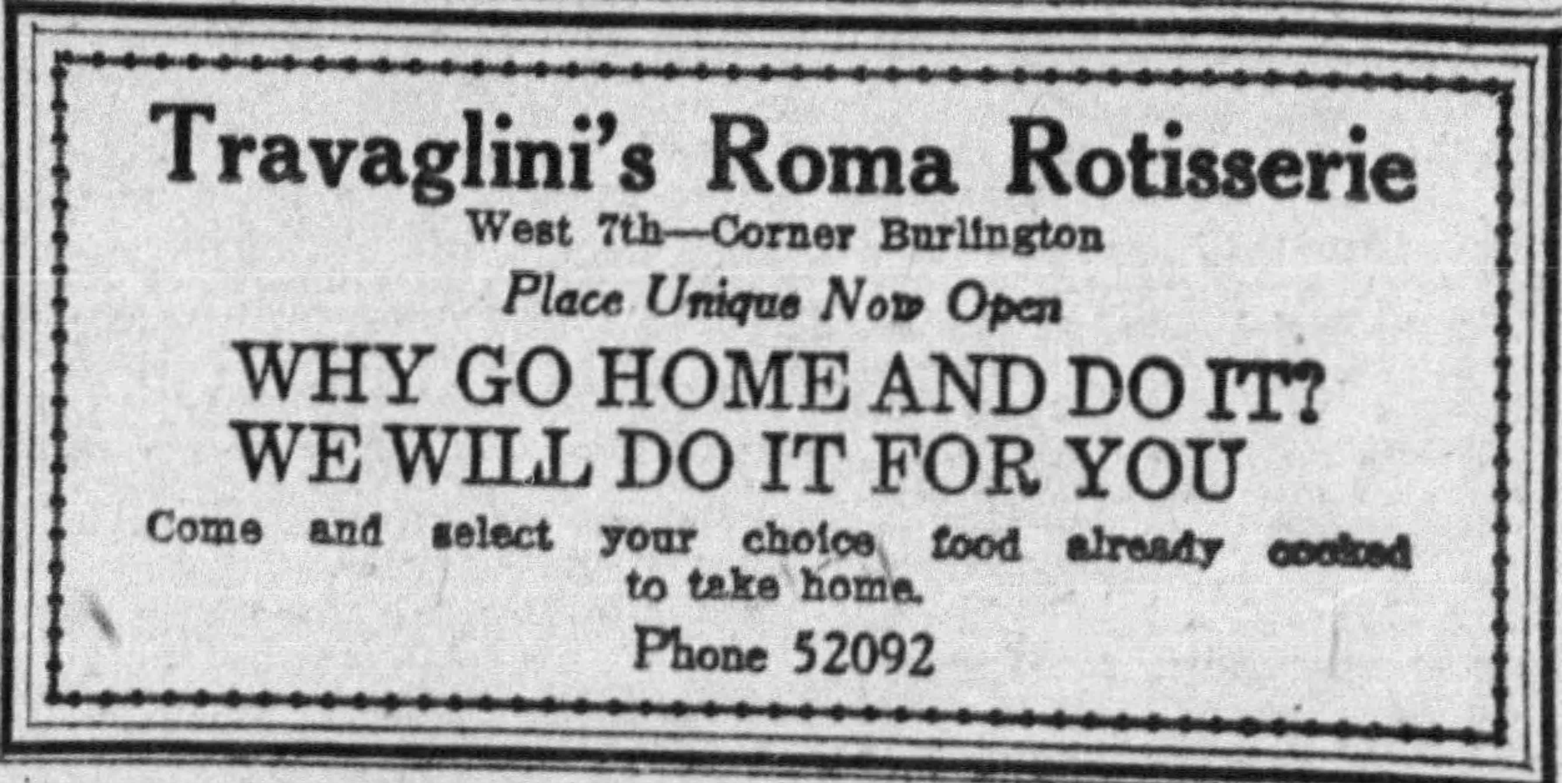 In 1923, Travaglini opened at 1801 W. 7th St. as Travaglini’s Roma Rotisserie, offering take-away meals. Two years later he expanded to 1803 to offer cafe service and groceries. This venture closed in June 1930, the fixtures and equipment sold at auction.
