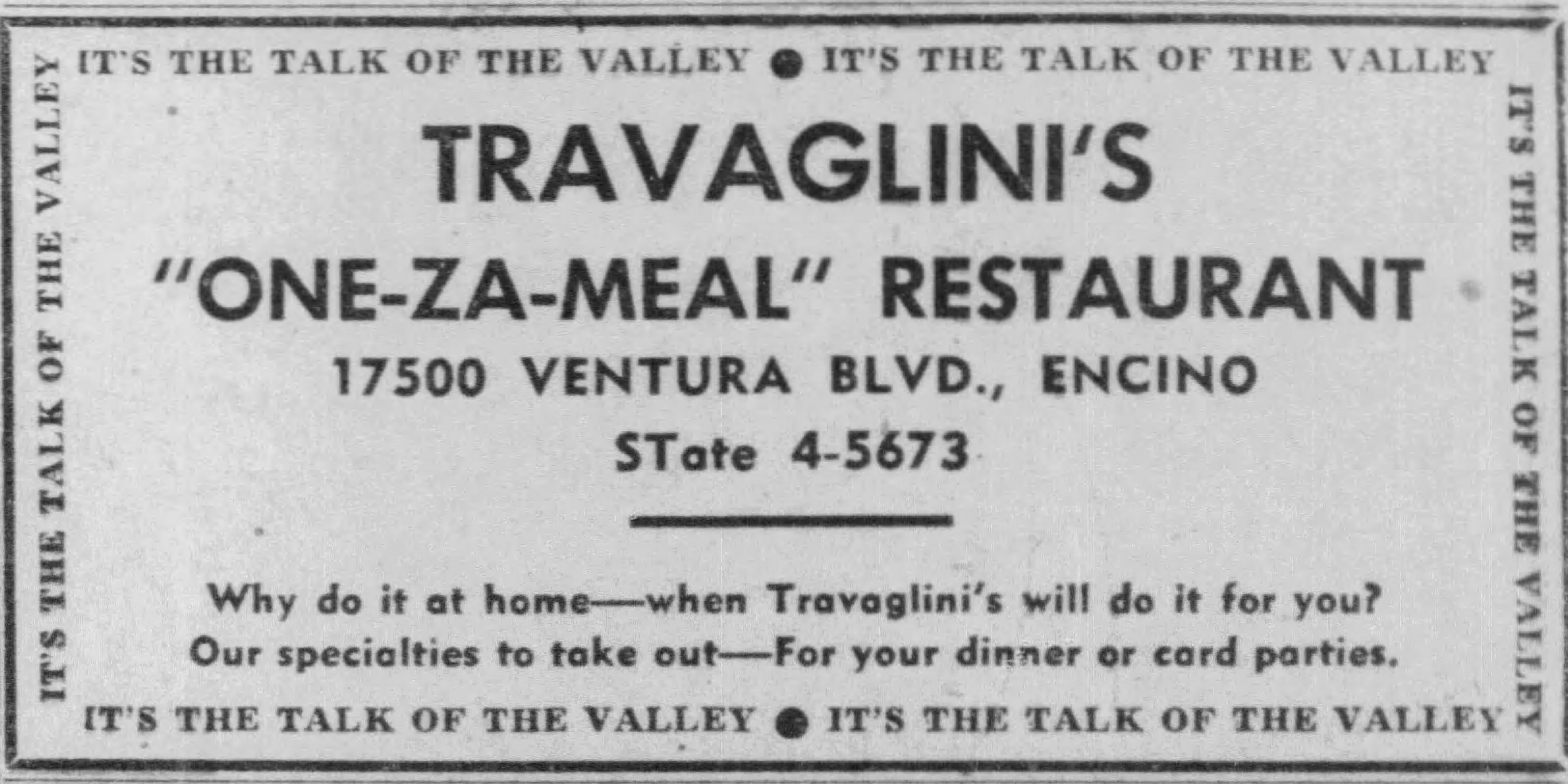 By the later 1940s, son Anthony “Tony” Travaglini ran the restaurant operation. In late 1947, he opened a second location at 17500 Ventura Boulevard in Encino, Travaglini’s One-Za-Meal Restaurant, featuring take-away meals and using the old “Why do it at home?” slogan.