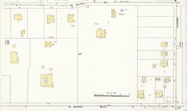 Detail from the 1907 Sanborn Fire Insurance Company map of Hollywood showing 369 West Sunset Boulevard, later 6657 Sunset. Hudson, to the West, would be renamed Cassil Place. LOC.