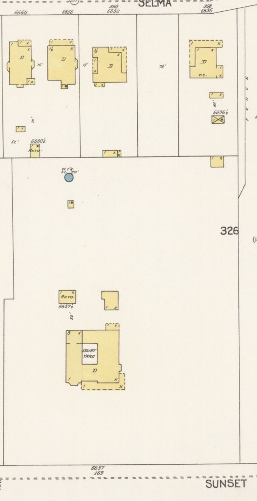 Detail from the 1913 Sanborn Fire Insurance map of Hollywood showing 6657 Sunset (formerly 369 West Sunset). LOC.