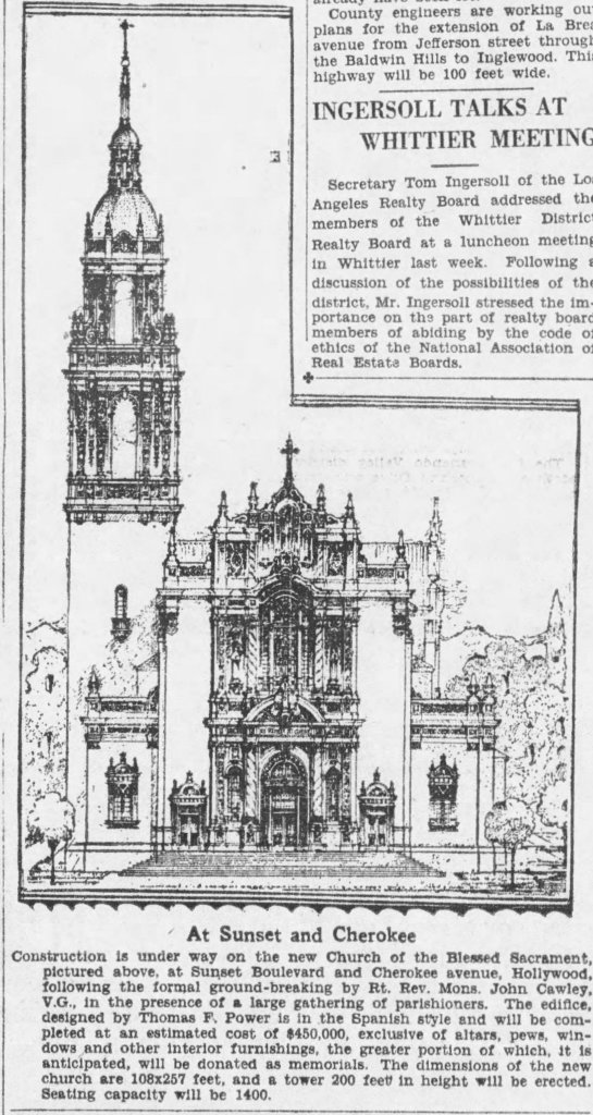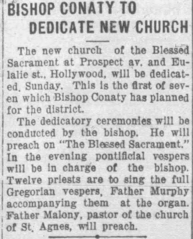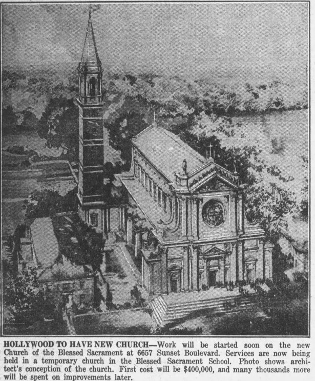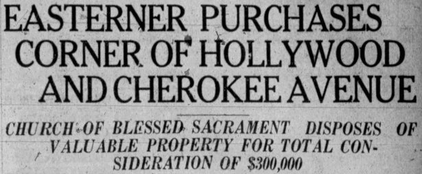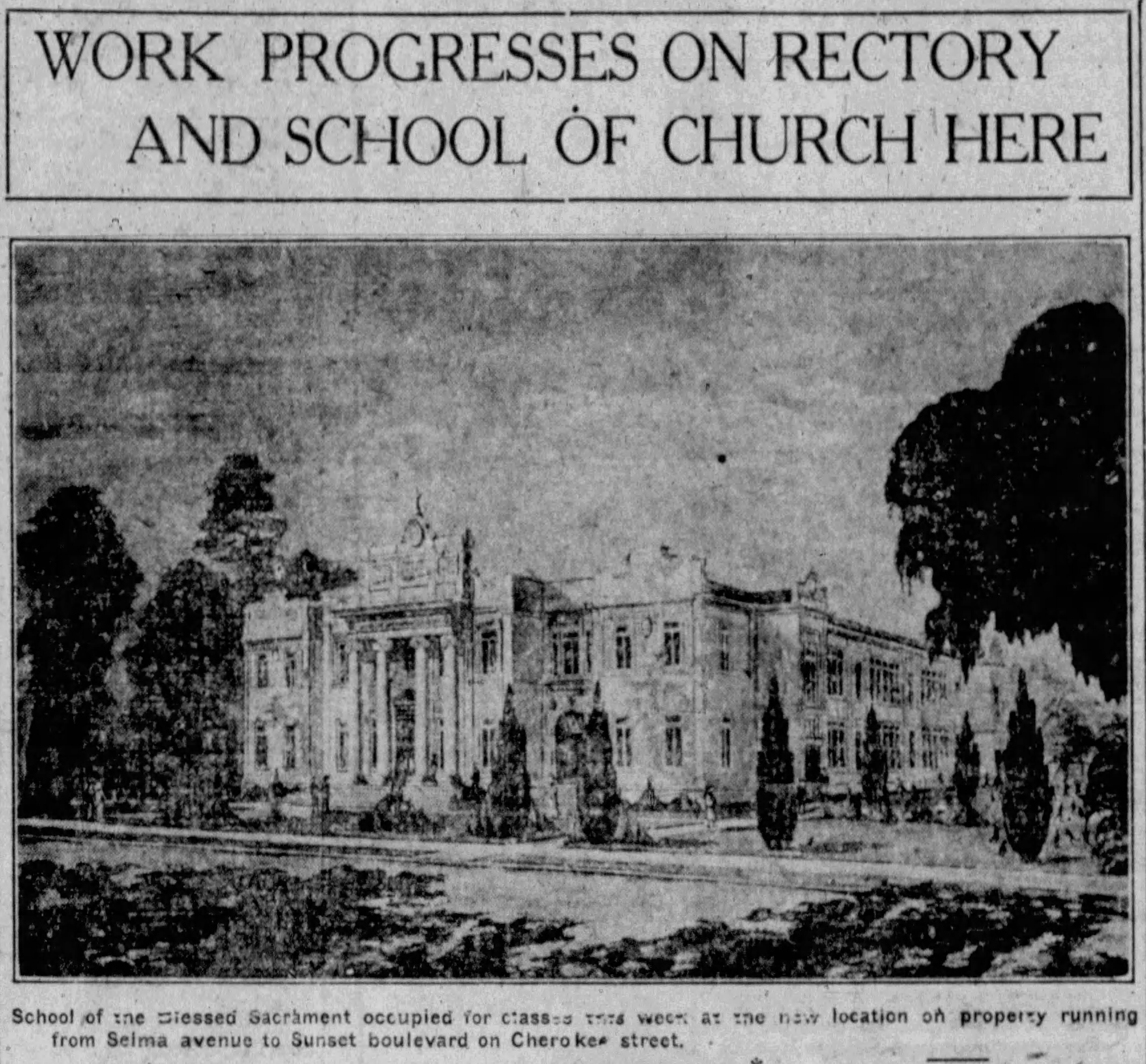 In November 1920, the Hollywood Daily Citizen reported that the Blessed Sacrament was planning to build a new school adjacent to its present church at the southeast corner of Hollywood Boulevard and Cherokee Avenue. The church had been at this corner, originally Prosepect Avenue and Eulalie Street, since 1904.