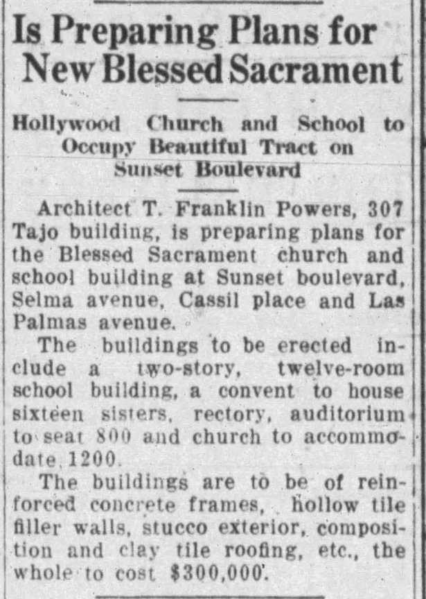 By the Spring of 1921, however, the parish had acquired 6657 Sunset Boulevard and put the Hollywood Boulevard property on the market. In August 1921, The Hollywood Daily Citizen reported that architect Thomas Franklin Powers was drawing up plans for a new Blessed Sacrament complex on the Sunset property, to consist of a 2-story, 12 room school building, a convent to house 16 sisters, a rectory, an auditorium to seat 800, and a church to accomodate 1200.