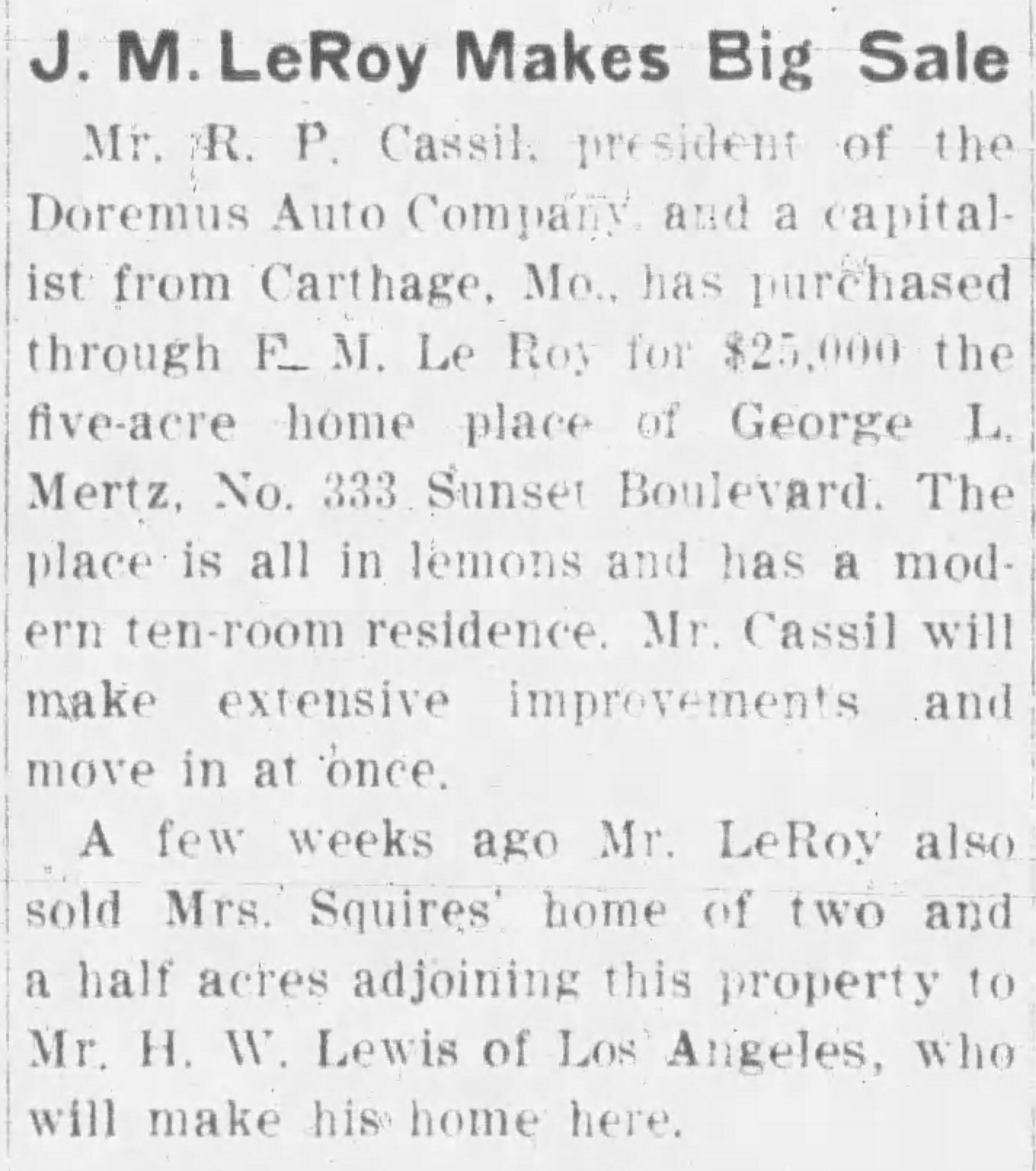 After his “retirement,” in 1911, Lewis bought an existing house with extensive gardens on what was then 369 West Sunset Boulevard (later 6657), formerly home to Mrs. William Squires.