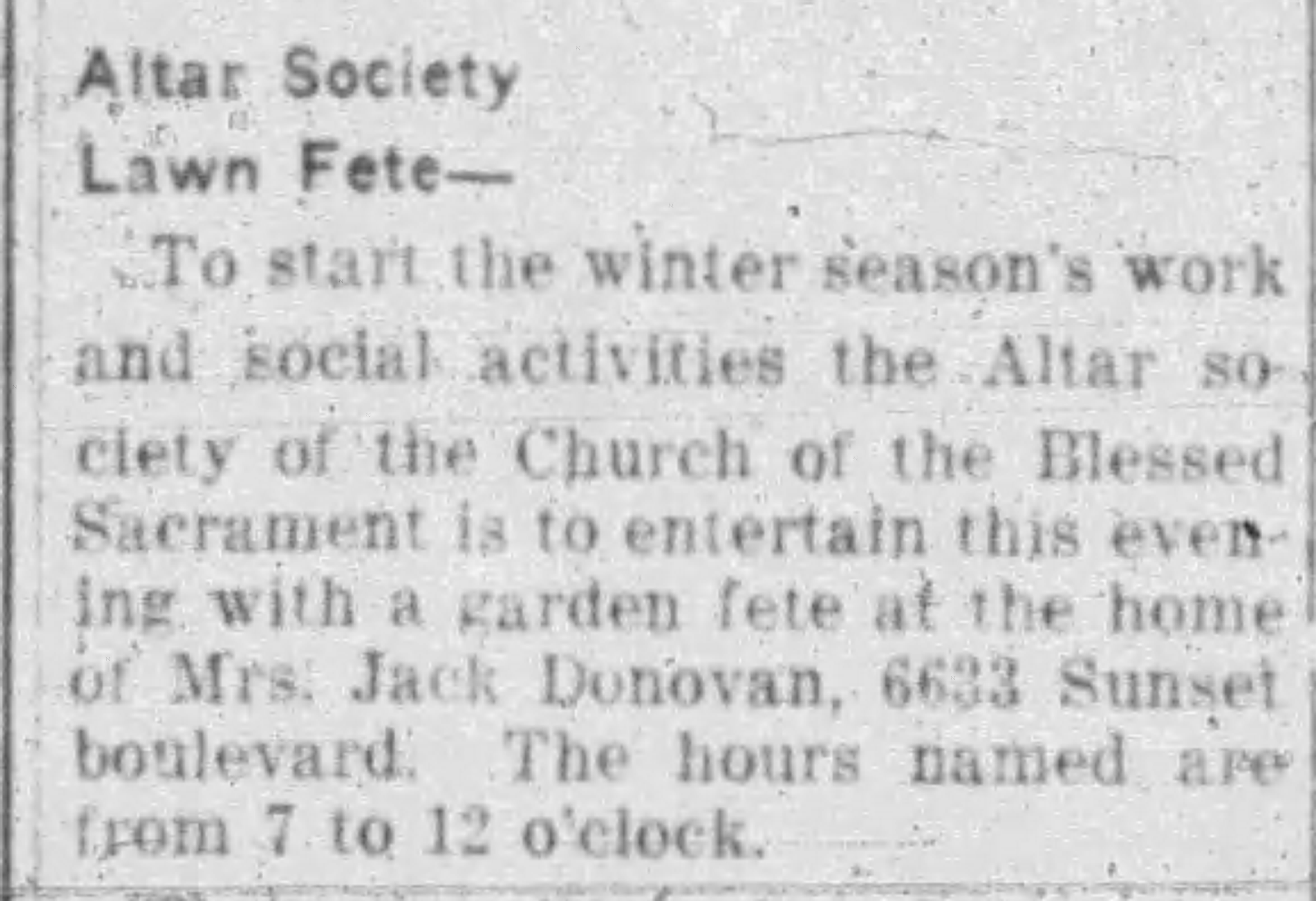 The Alter Society of the Church of the Blessed Sacrament held a garden fete at the home of the parish’s future neighbors Jeanette Donovan and her son Jack next door at 6633 Sunset. 10/12/1921 Hollywood Daily Citizen.