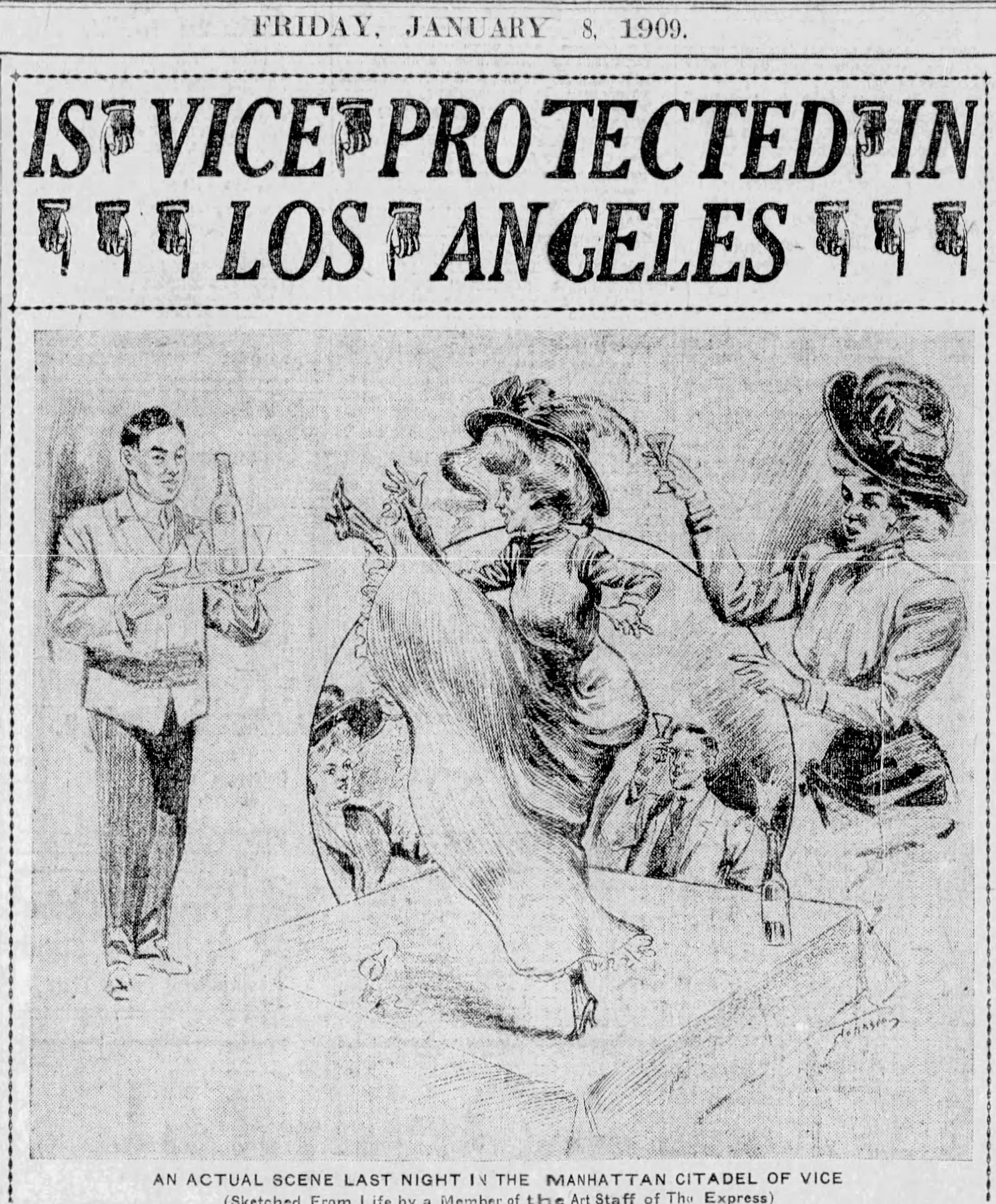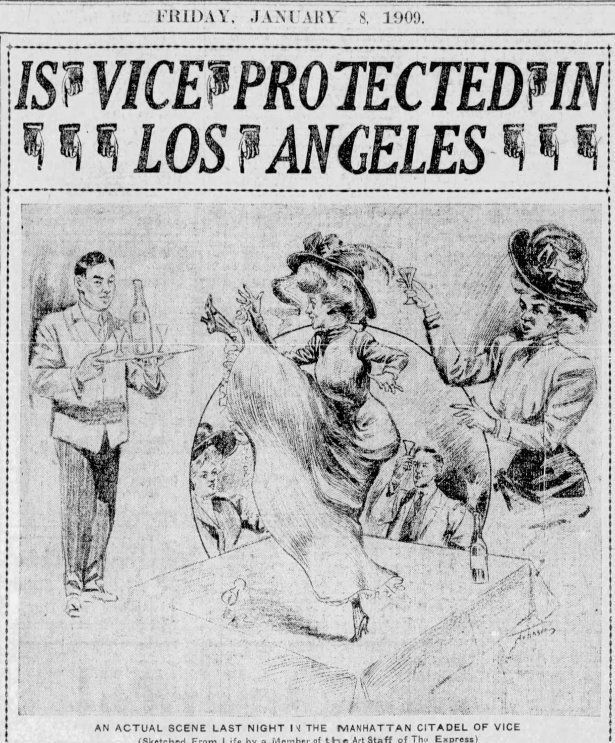 The LA Express’ undercover invetigation into doings at the “citadel of vice,” the Manhattan Hotel and its connection to Police Commissioner H.W. Lewis. 1/8/1909 LA Express.