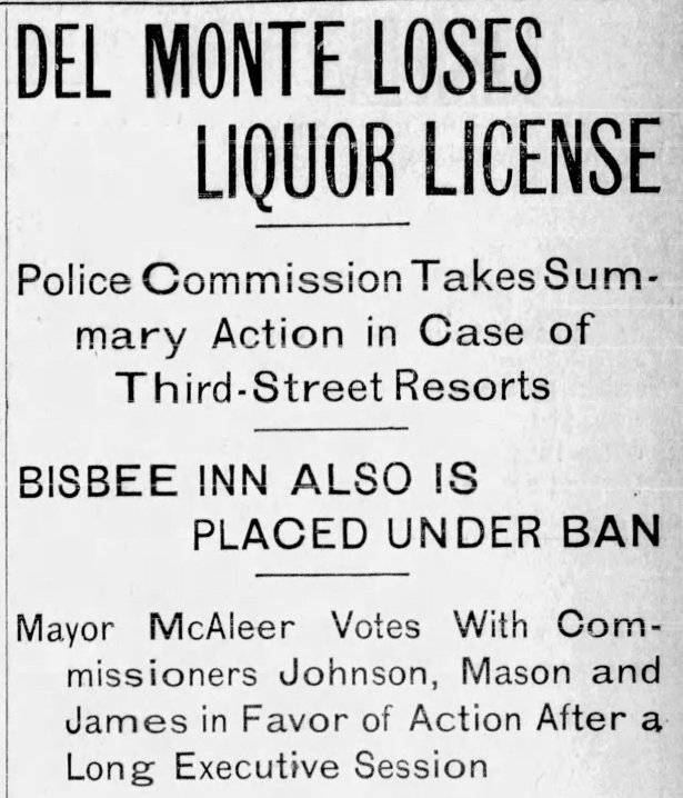 Citizen outrage over the death of a young girl named Minnie Blough in February 1906 at another notorious dive down the steet called the Del Monte Tavern and the apparent attempt by police to over up the circumstances of her death, was too loud to ignore. Both establishments lost their liquor licenses.