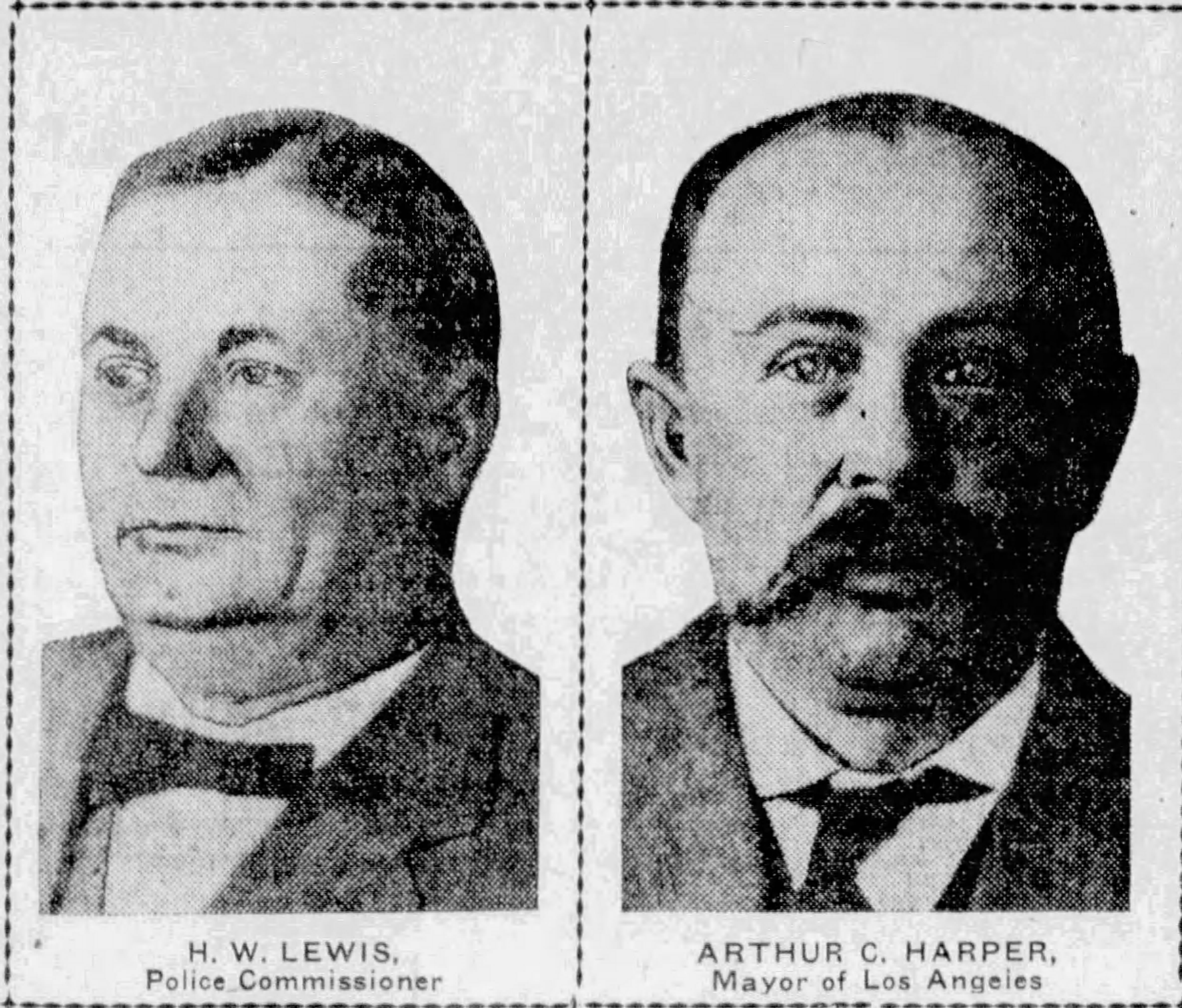Woolwine began hearing rumors of misconduct by city officials with regard to the opertion of the red-light district. In May, with the help of private detectives, he began a secret investigation which ultimately found that Los Angeles was on the brink of becoming an “open town,” with widespread gambling and bookmaking as well as a thriving Tenderloin, and allegations of protected vice that went all the way to the mayor’s office. On August 3, 1908 wrote to Mayor Harper in Harper’s capacity as head of the Police Commission, demanding Harper launch an investigation. Harper told Woolwine to go ahead and investigate him.