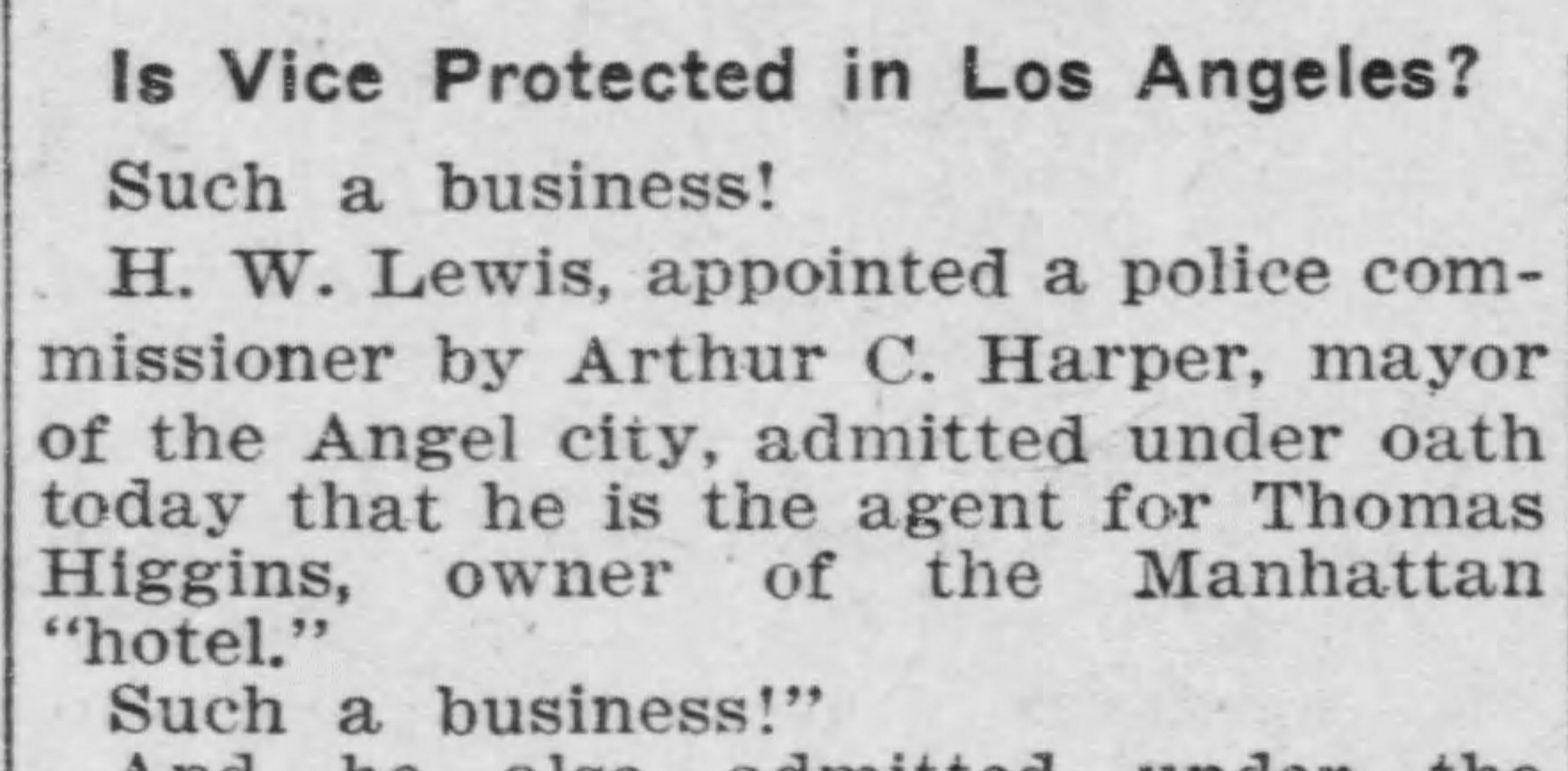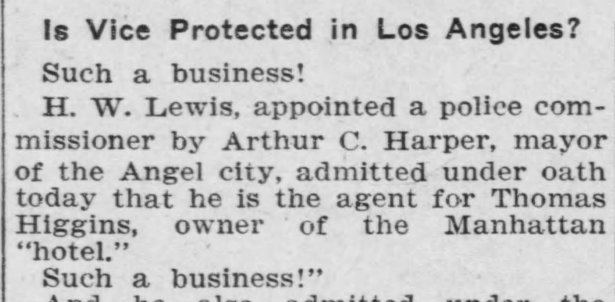 Harbert William Lewis came to Los Angeles in 1897 and took up real estate. In February 1904, was appointed to the Police Commission by Mayor Meredith “Pinky” Snyder, during Snyder’s second non-consecutive term. At that time the Mayor was also head of the Police Commission. Owen McAlear succeeded Snyder in December 1904 and Lewis continued in real estate. He brokered several deals for Thomas Higgins, a retired mining man from Arizona. In 1905, Higgins built a 6-story hotel at 115 East Third Street he named the Bisbee Inn. It became a notorious dive, managed by James E. “Chowder Jim” Dunne, with drinking parties and secret passages and elevators that whisked guests to private dining rooms and even more private bedrooms. When citizen complained, the police raided, yet somehow the place was always quiet when authorities arrived.