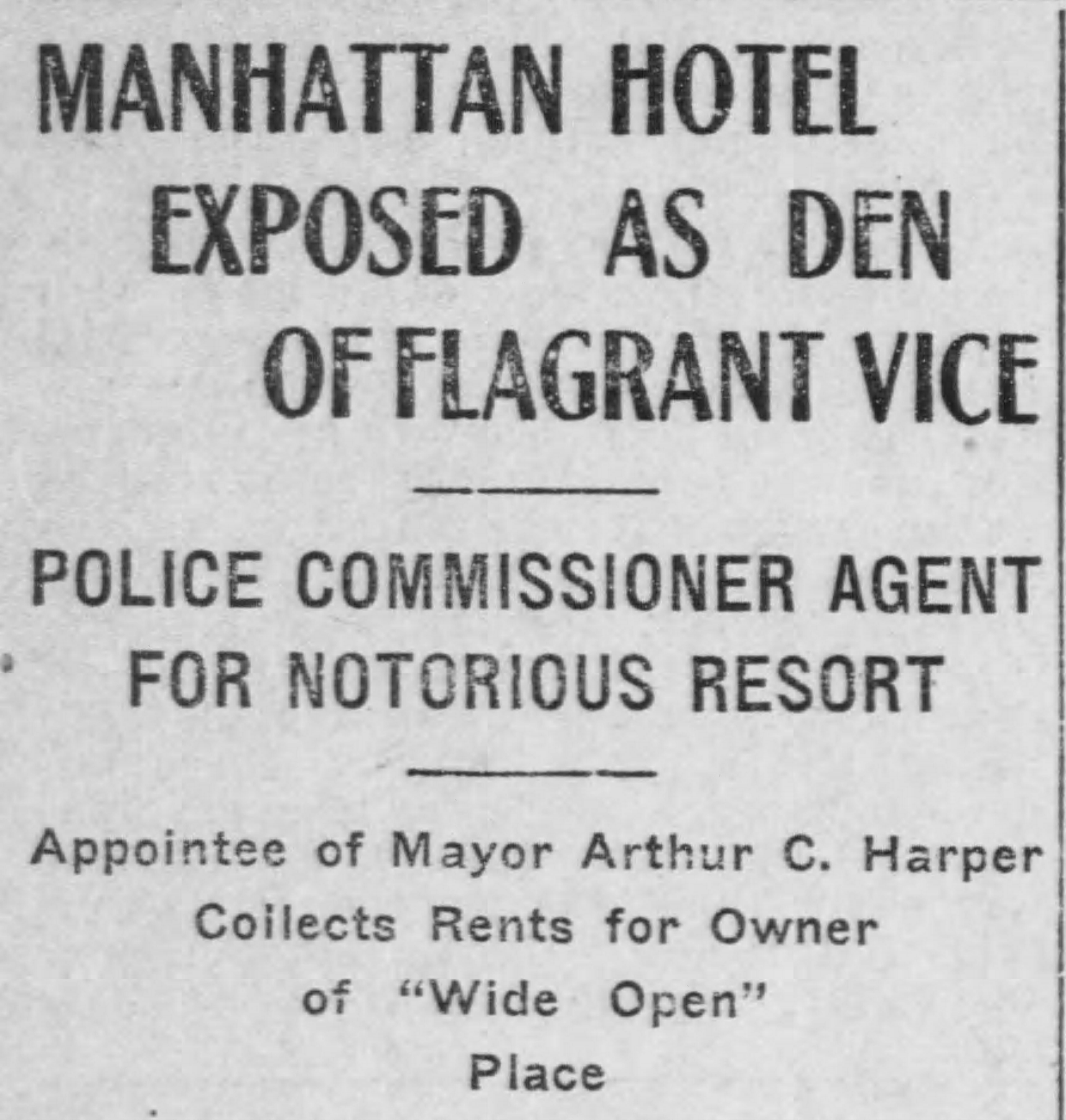 One of the things he exposed, in January 1909, was the fact the H. W. Lewis had been Higgins’ bagman, collecting rents from the Bisbee Inn/Manhattan Hotel from Chowder Jim for Higgins, including while a Police Commissioner. Property owners loved to rent to shady businesses as they could charge exhorborent prices and, when the inevitable expose came, could cling to respectability, claiming to know nothing of what went on in the buildings they owned. What the Express saw at the Manhattan Hotel was too terrible to be printed in a family newspaper.