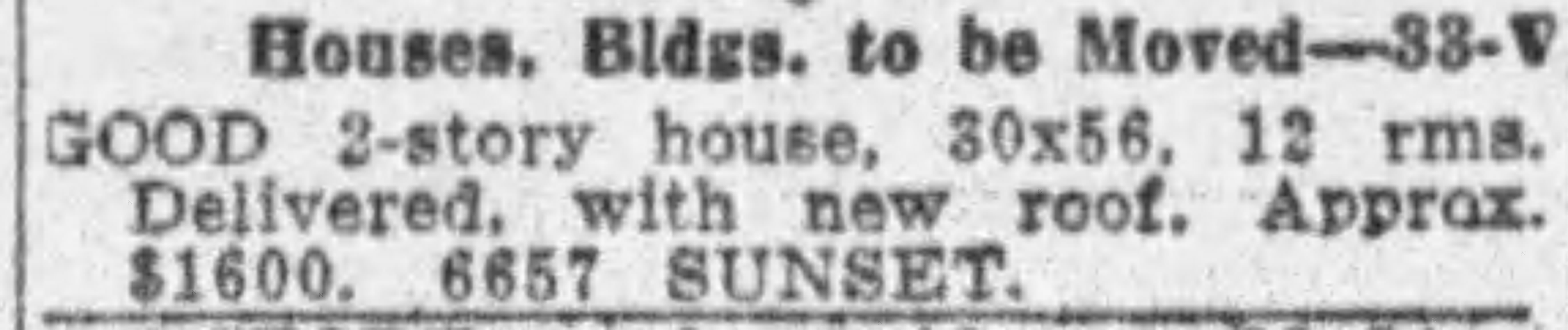 A 12-room 2-story house was to be moved from 6657 Sunset to make room for the new Blessed Sacrament Church building. 11/26/1926. LAT.