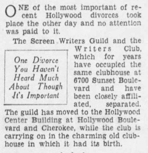 In 1933, the Screen Writers Guild was organized as a union and in May 1933 moved out of the clubhouse to new quarters in the Hollywood Center Building at 6650 Hollywood Boulevard.