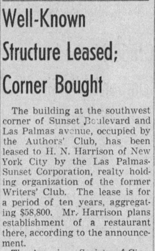 The Writer’s Club became the Authors Club and continued at 6700 until January 1937, when owners the Las Palmas and Sunset Corporation raised its rent from $300 a month to $450. The club moved out and established its new headquarters at the Knickerbocker Hotel on Ivar Street.