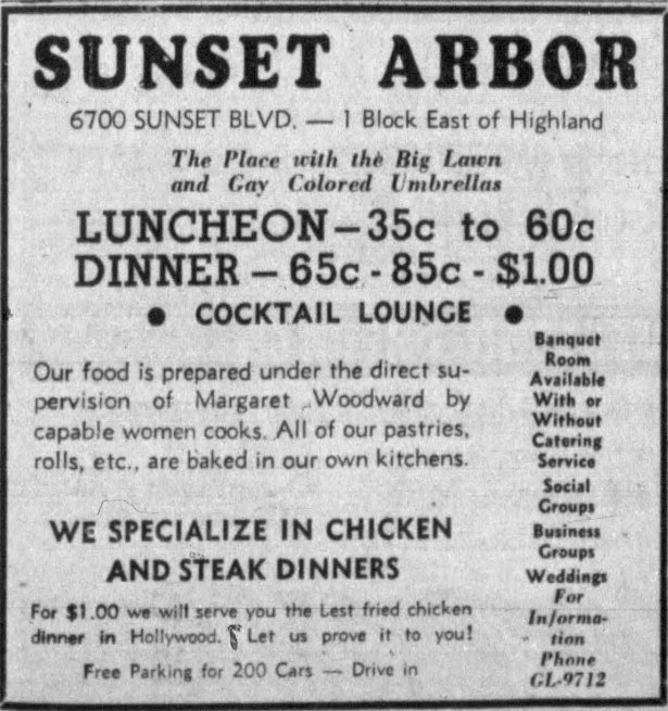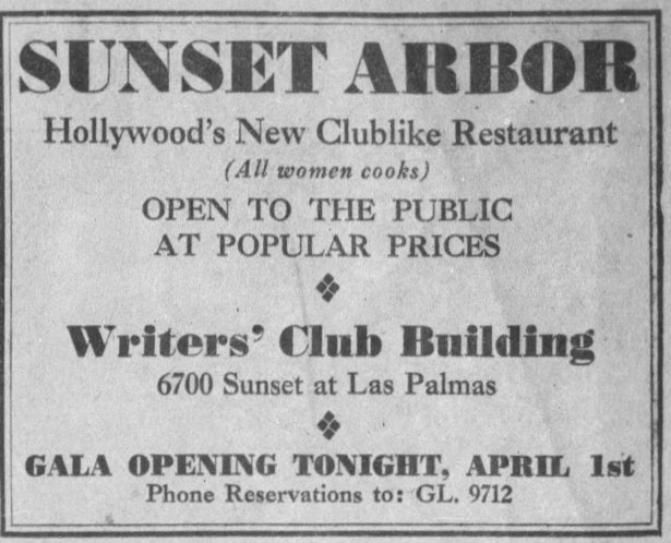 The same month, Las Palmas and Sunset Corporation leased 6700 Sunset to Chicagoans Mrs. Margaret Woodward and William Harrison for use as a restaurant, Sunset Arbor. The building was refurbished, refurnished, repainted, redecorated and remodeled. Meals would be served in the dining room and in the large screened-in porch as well as outdoor dining on the lawn. The auditorium, game rooms and supper rooms were available to rent for parties. Sunset Arbor with its all women cooks opened April 1, 1937.