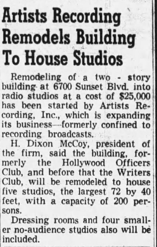 In January 1947, 6700 Sunset was being carved up for use as Dixon McCoy’s recording studio.