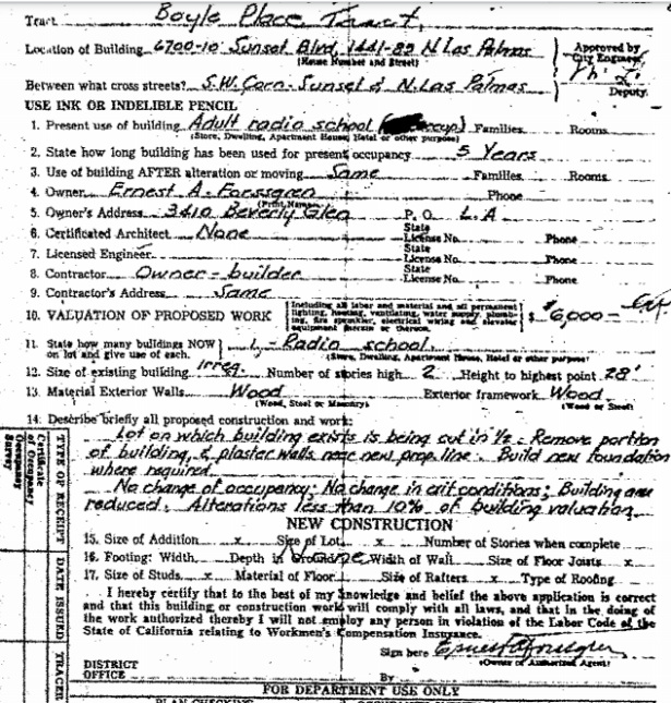 Filed with the permit of 10/9/1951, the permission to changed the building’s address from 6700 Sunset to 1445 N. Las Palmas was granted 2/6/1952.
