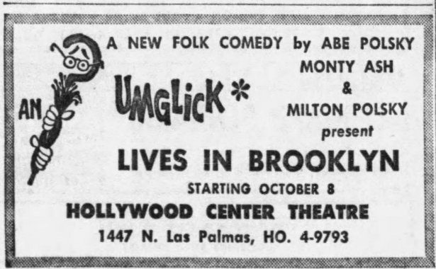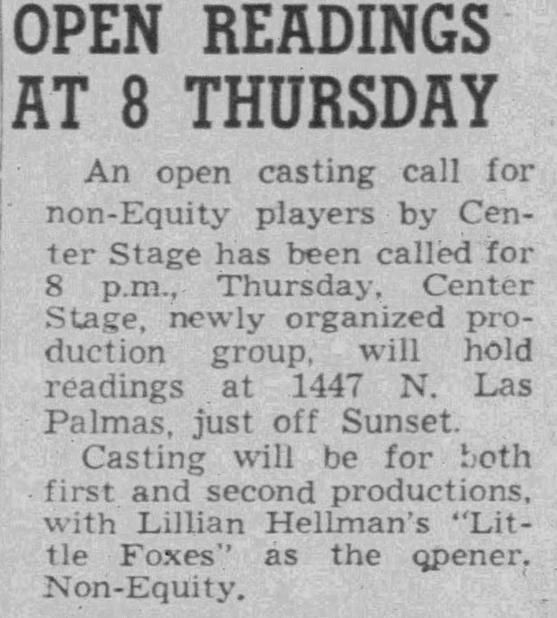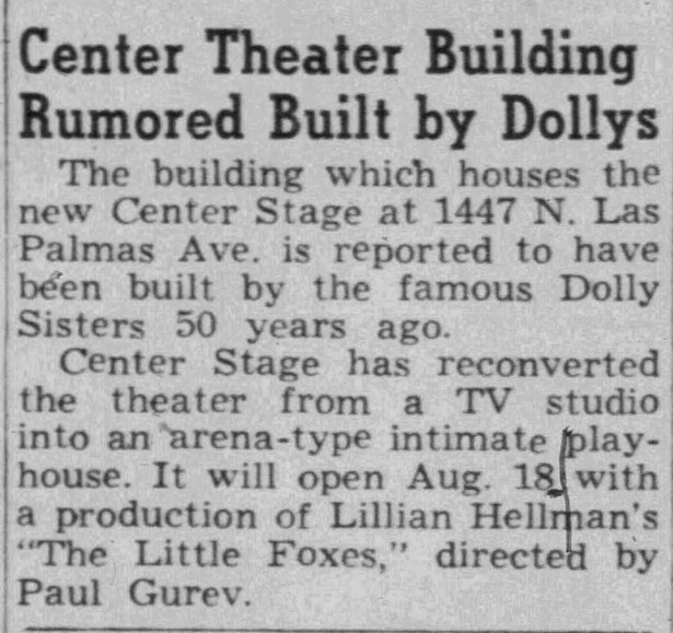 Center Stage’s first production at 1447 N. Las Palmas was The Little Foxes in August 1955. None of the information about the history of the theater was correct. It was NOT built by the Dolly Sisters. The Dollys, Rosie and Jenny, had only come to the USA as girls in 1905 and were on the east coast. As seen above, the theater, when it was still an addition to the Writers Club building, had a brief association with the Duncan Sisters. And it was the original mansion that was built c. 1905, not this theater addition. Perhaps it is a case of someone getting details confused, as is often the case with Hollywood buildings.