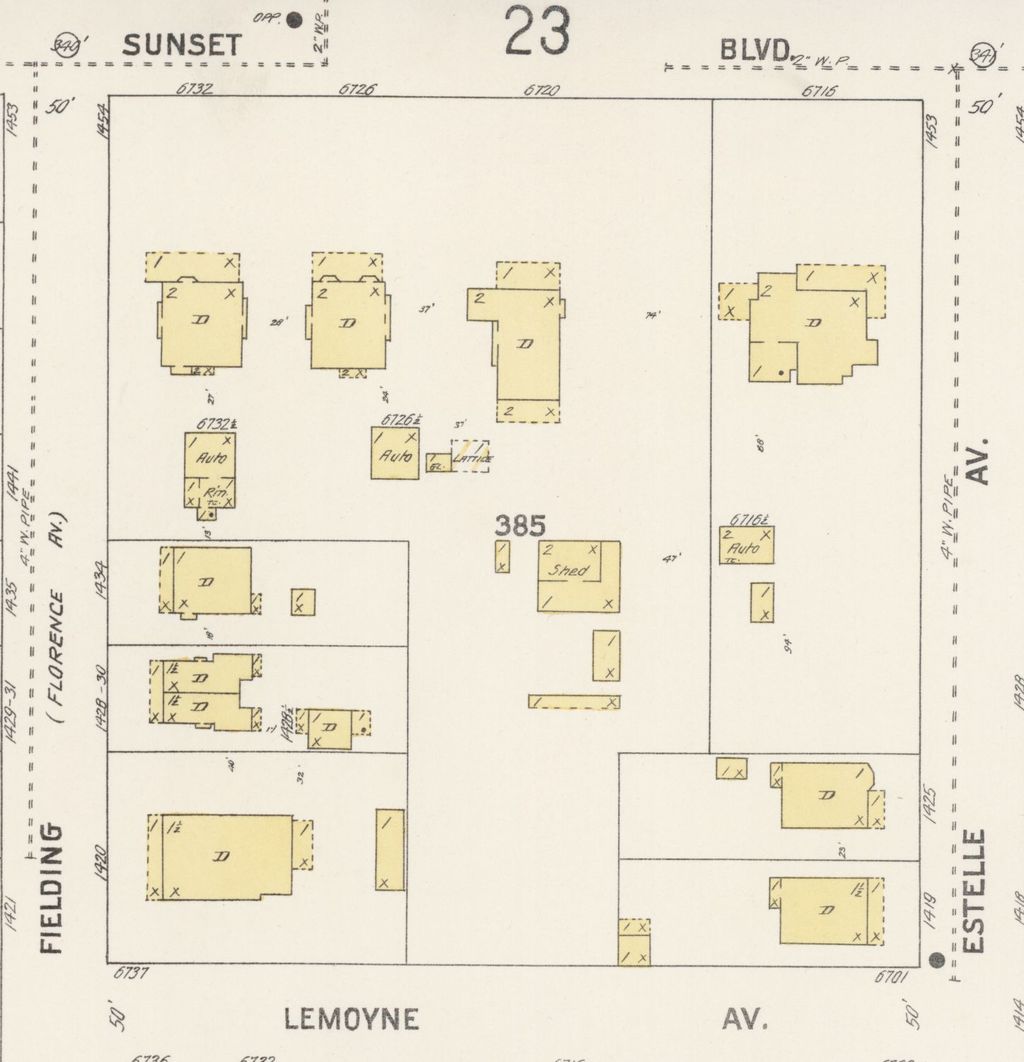Detail from 1913 Sanborn Fire Insurance Company map for Hollywood showing 6700 Sunset- then 6716. Estelle Avenue (originally Palm) later became Las Palmas. Lemoyne became Leland. Fielding Avenue (originally Florence) became McAdden Place. LOC.