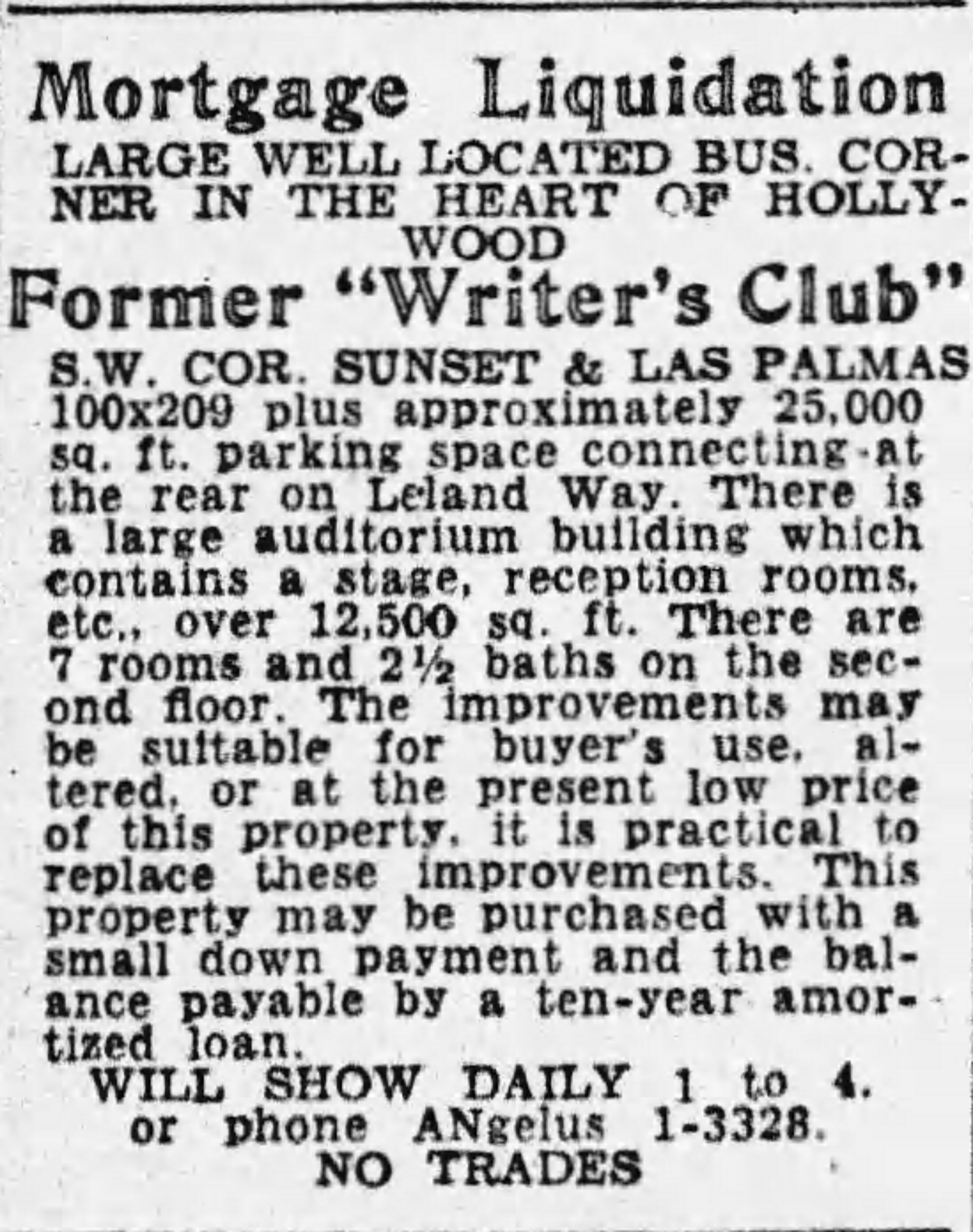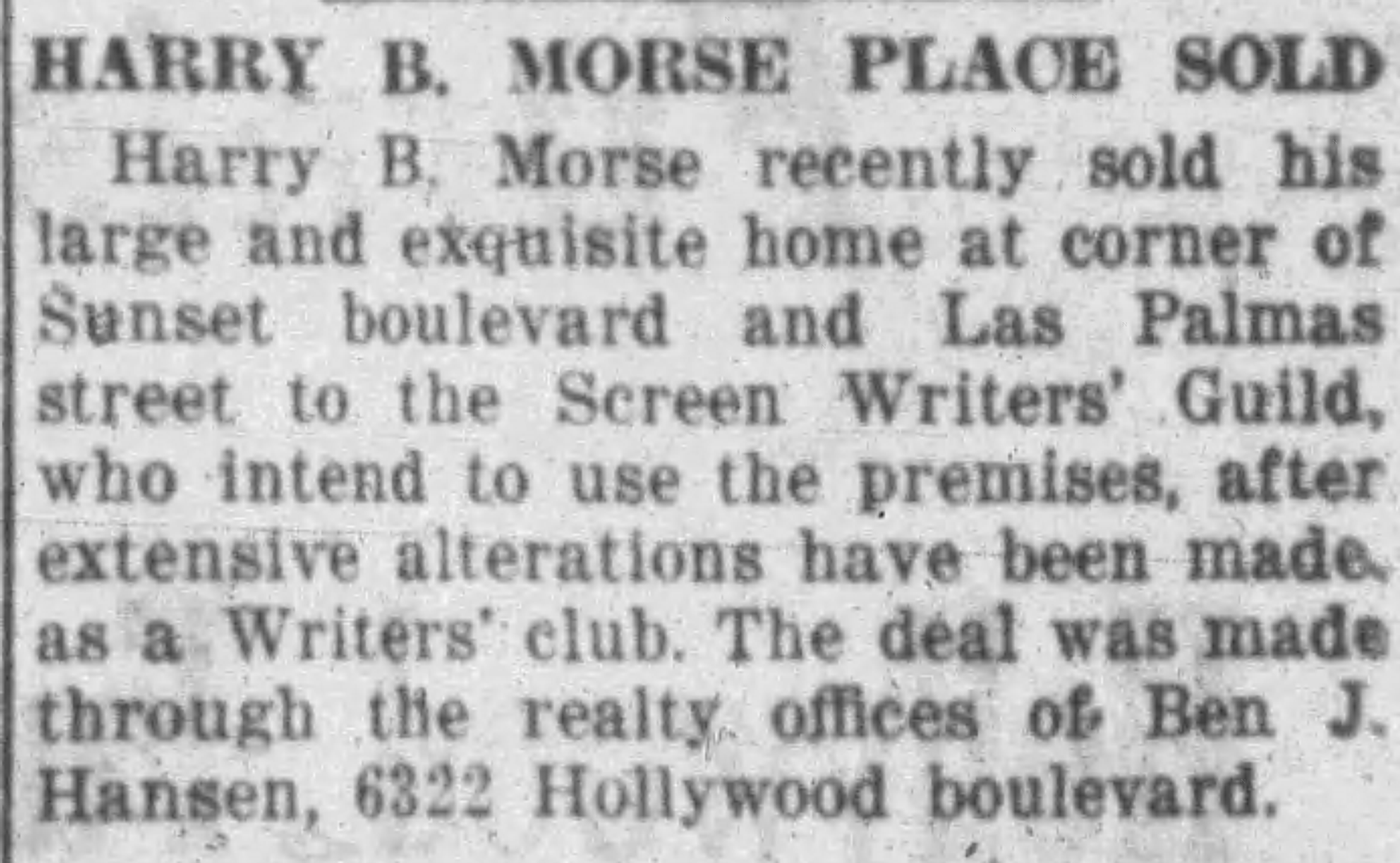 In 1921, Morse sold the property to a holding company, the Las Palmas and Sunset Corporation, for use as a clubhouse by the Screen Writers’ Guild (at this time organized as an informal club not a union), aka the Screen Writer’s club, aka the Hollywood Writer’s Club.