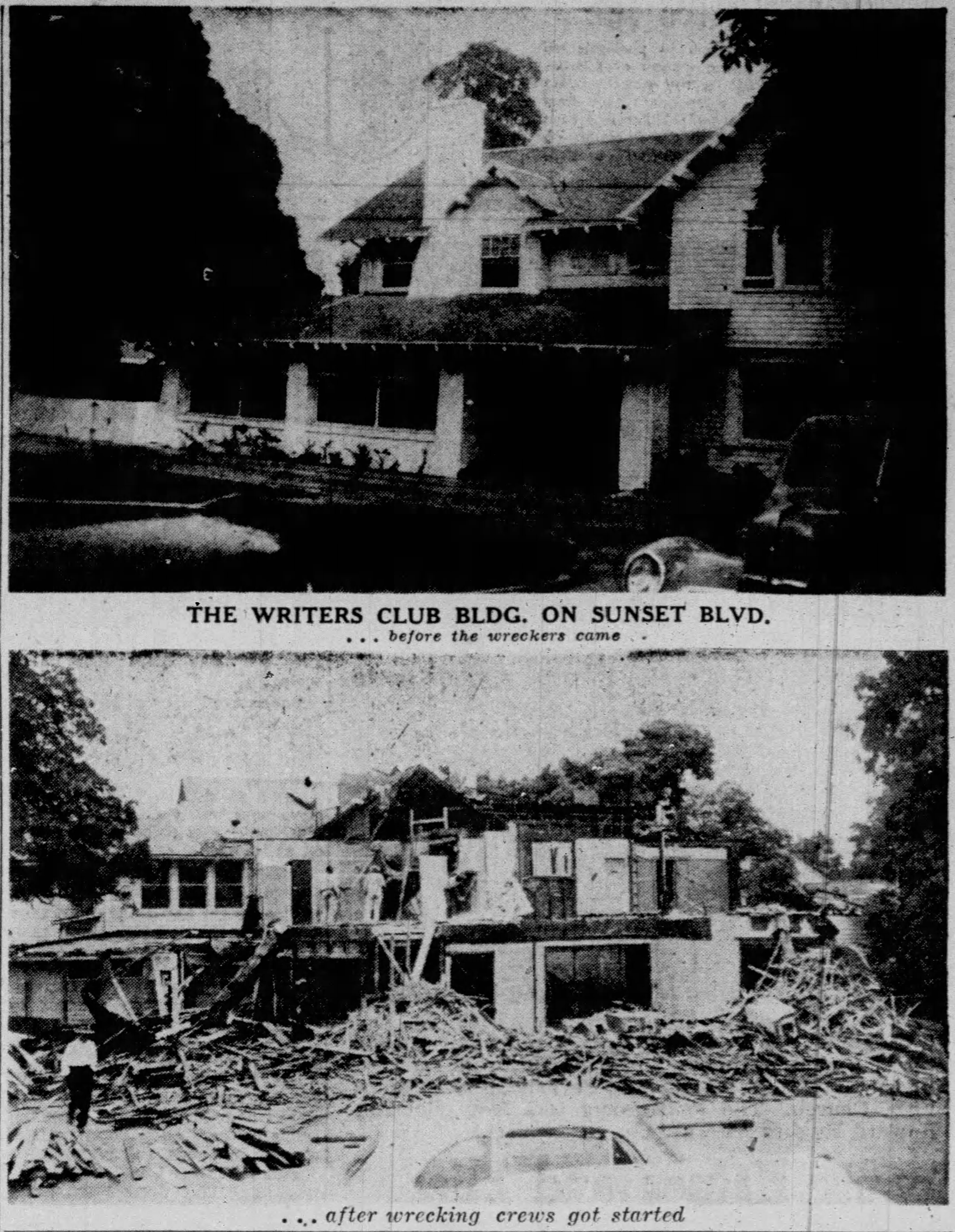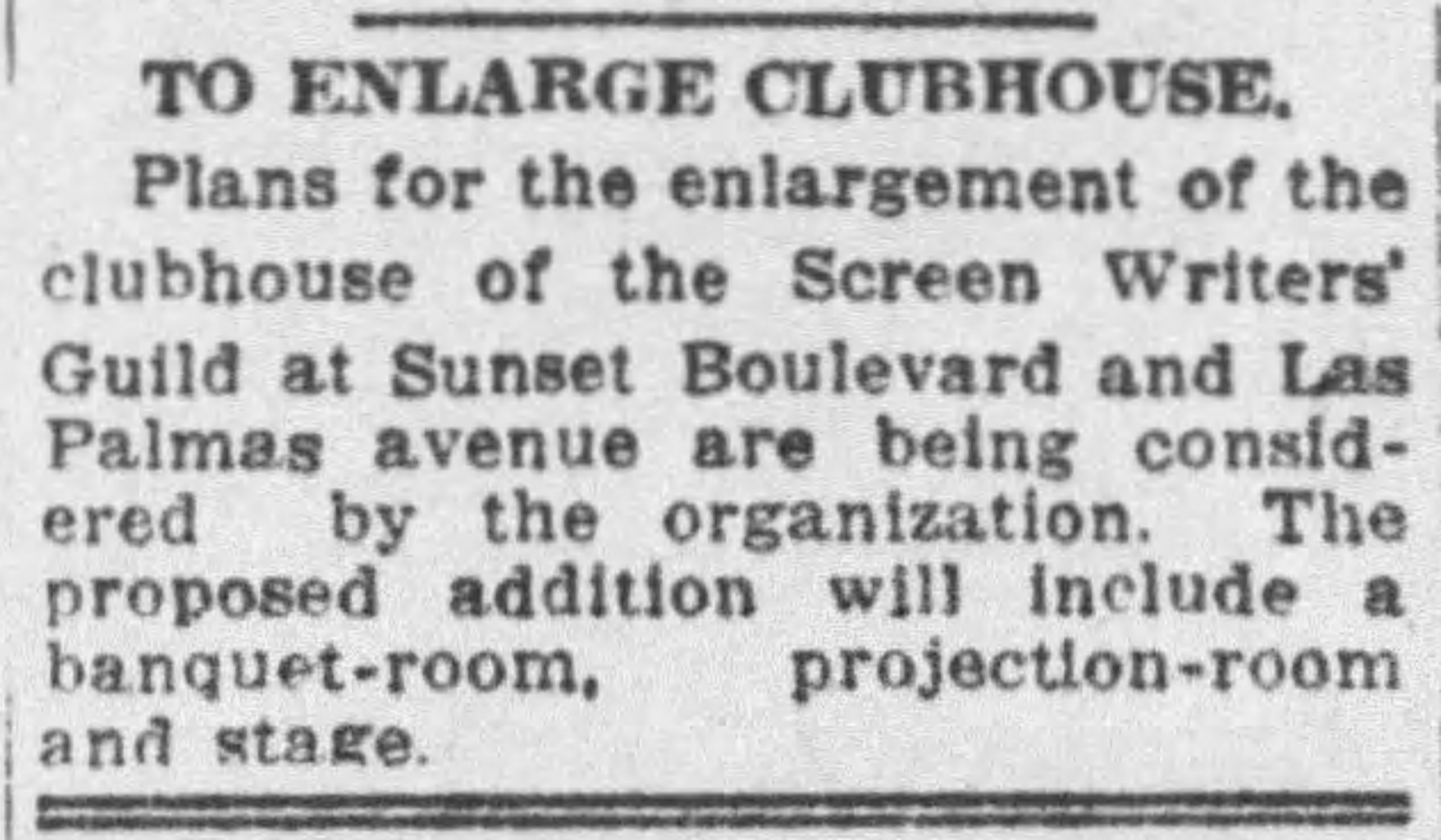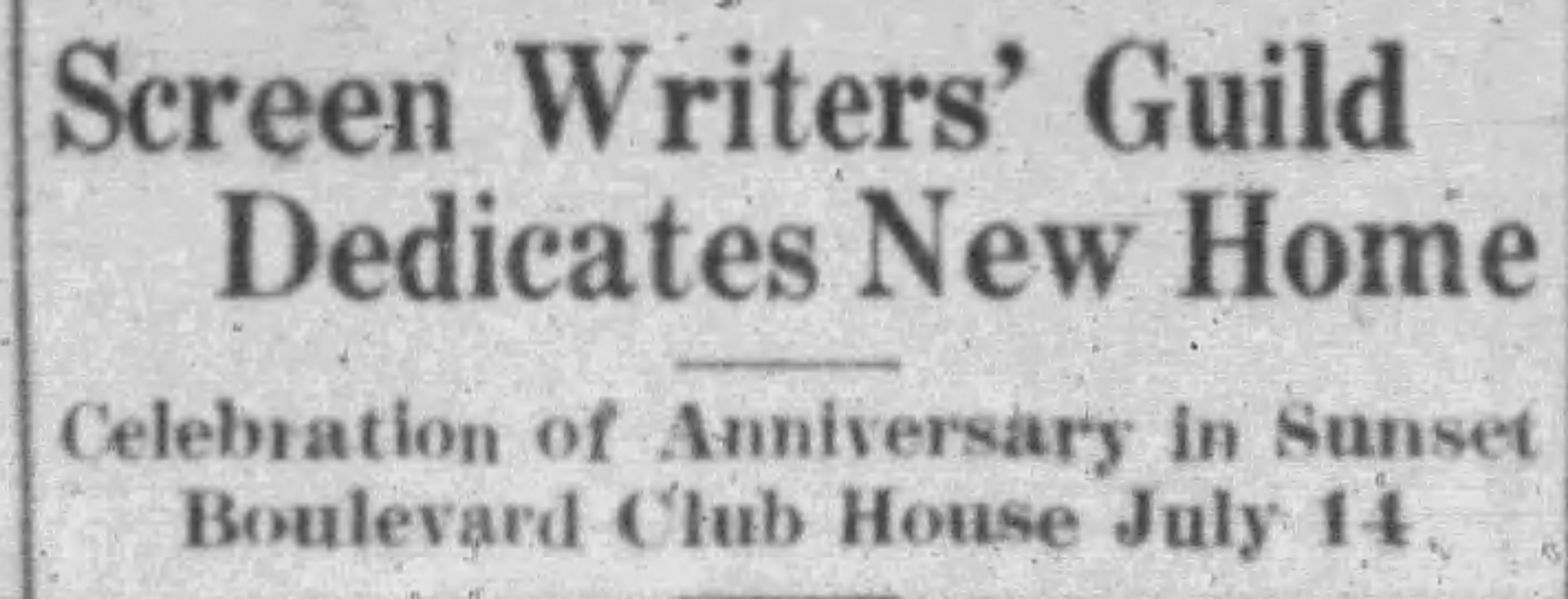 In 1933, the Screen Writers Guild was organized as a union and in May 1933 moved out of the clubhouse to new quarters in the Hollywood Center Building at 6650 Hollywood Boulevard.