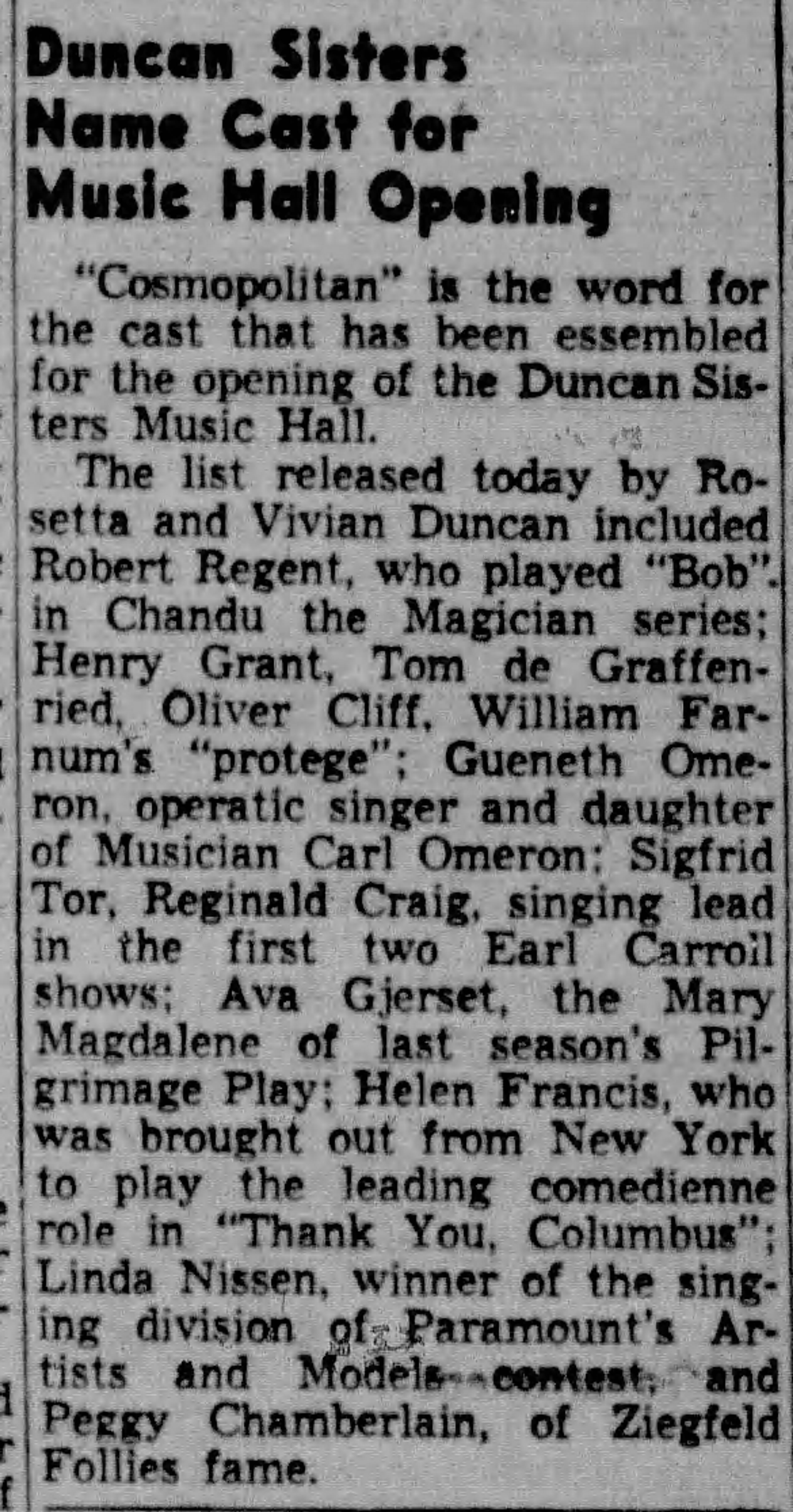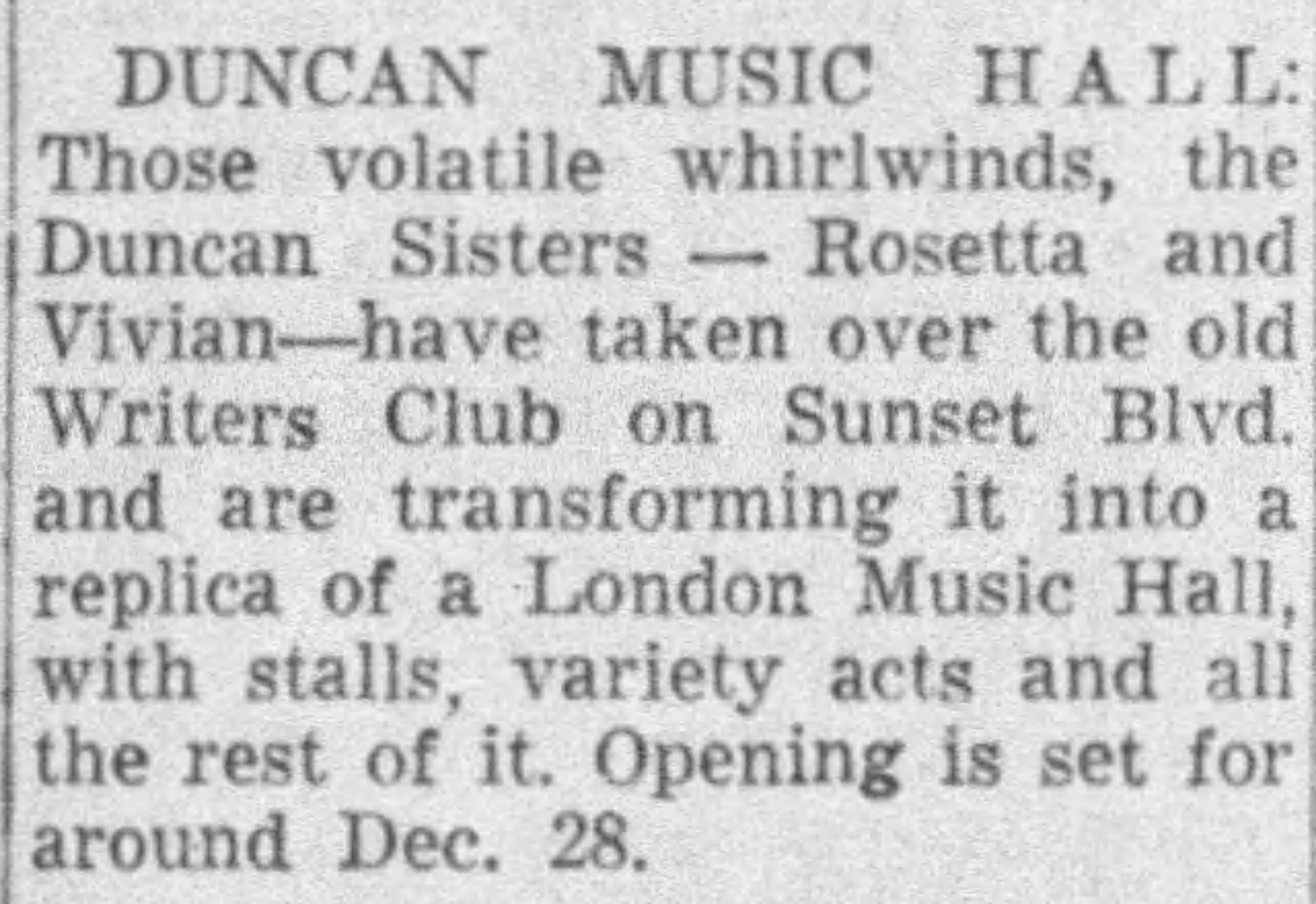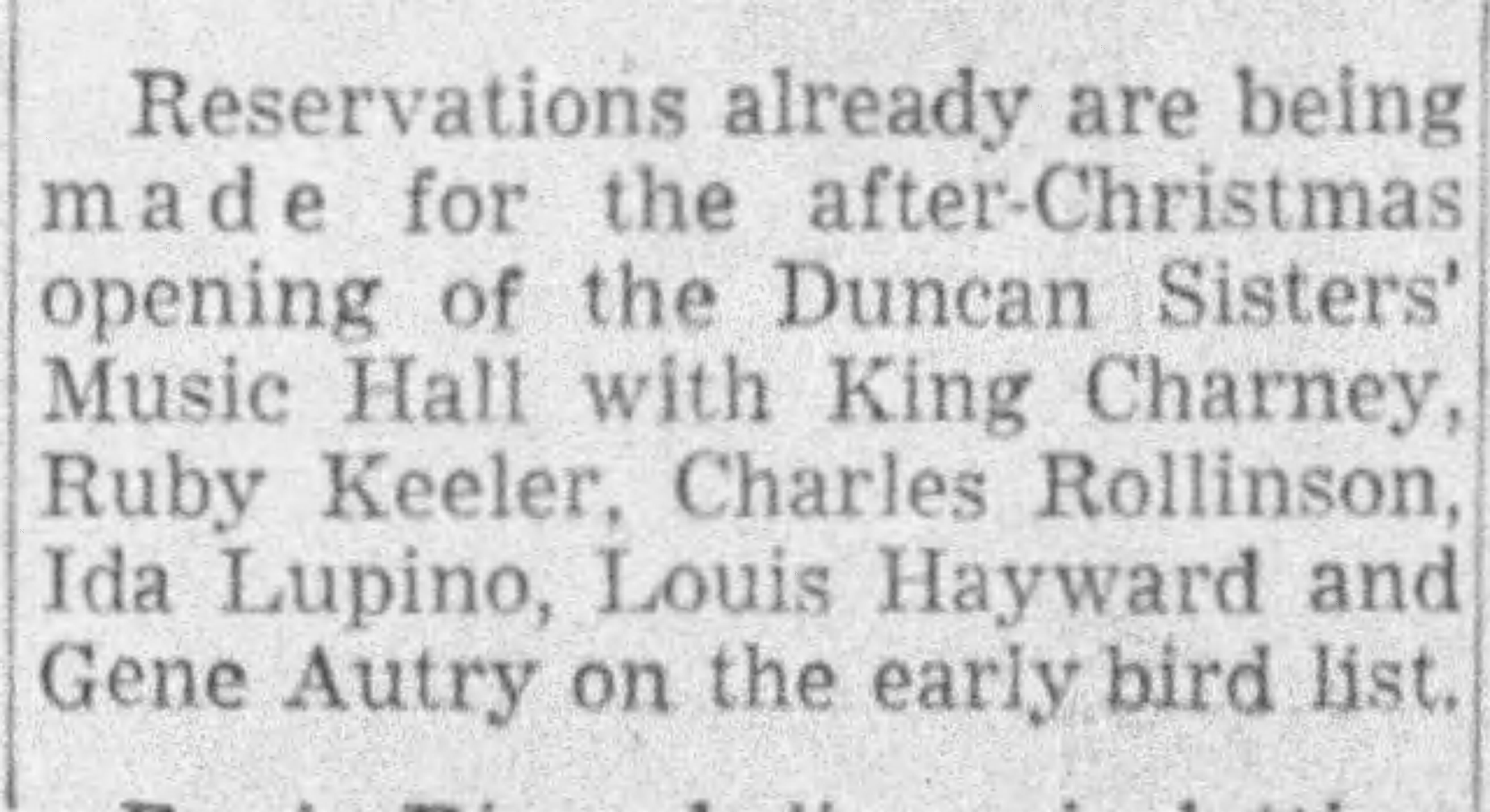Shortly after, the sisters announced they were turning 6700 into a ye olde English-style music hall nightclub, to be called Duncan’s Music Hall. The opening was scheduled for “about” December 28. 1940.