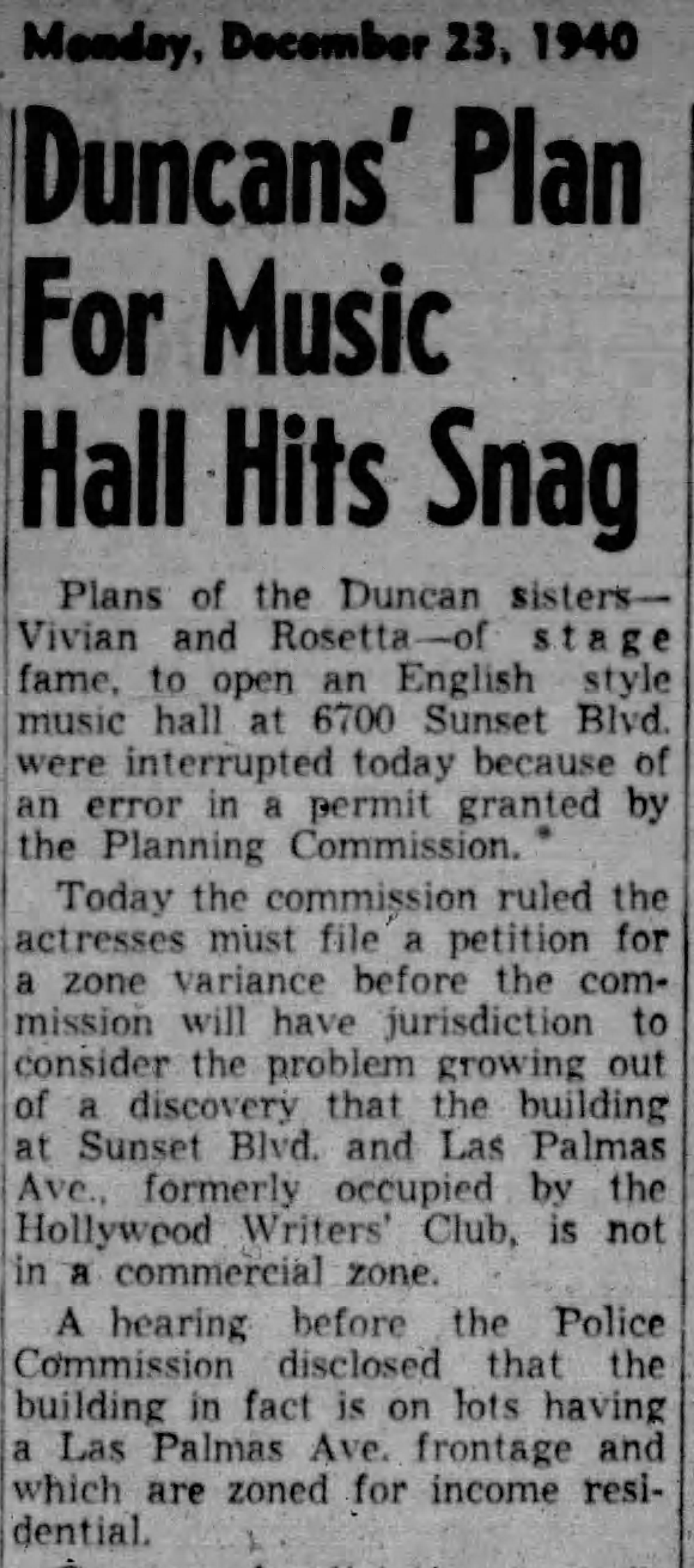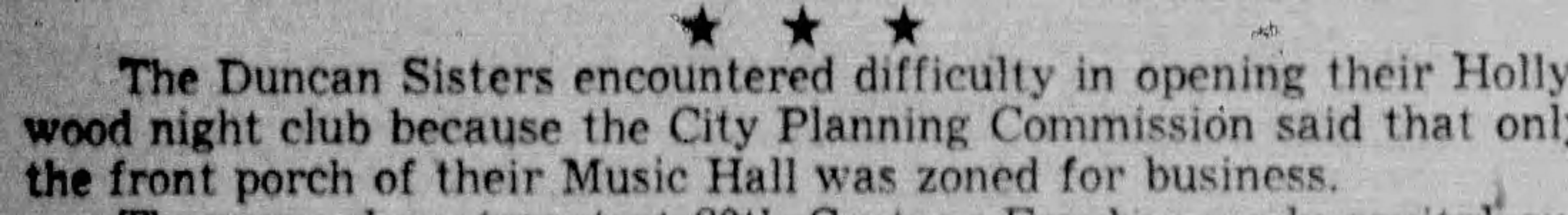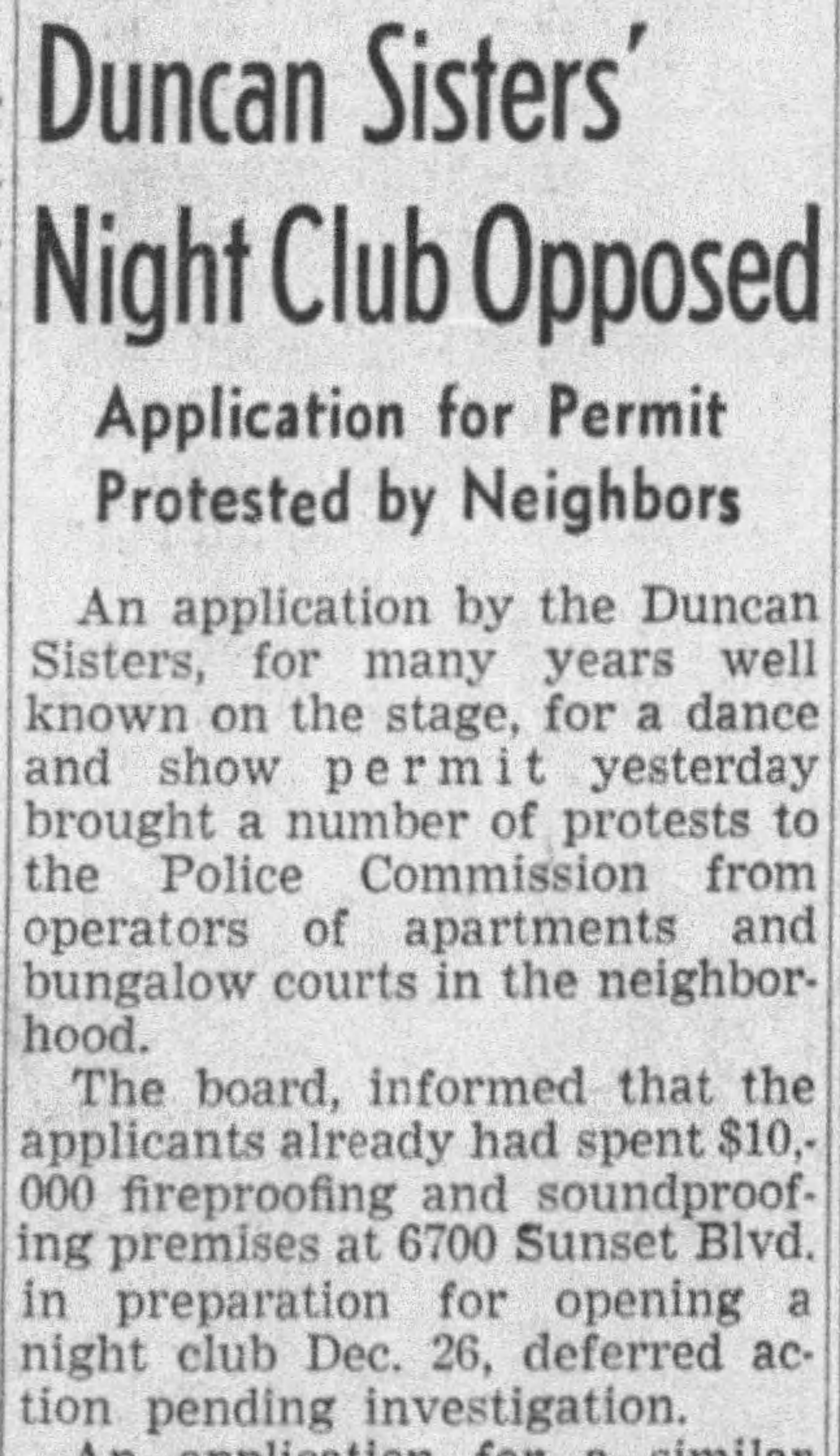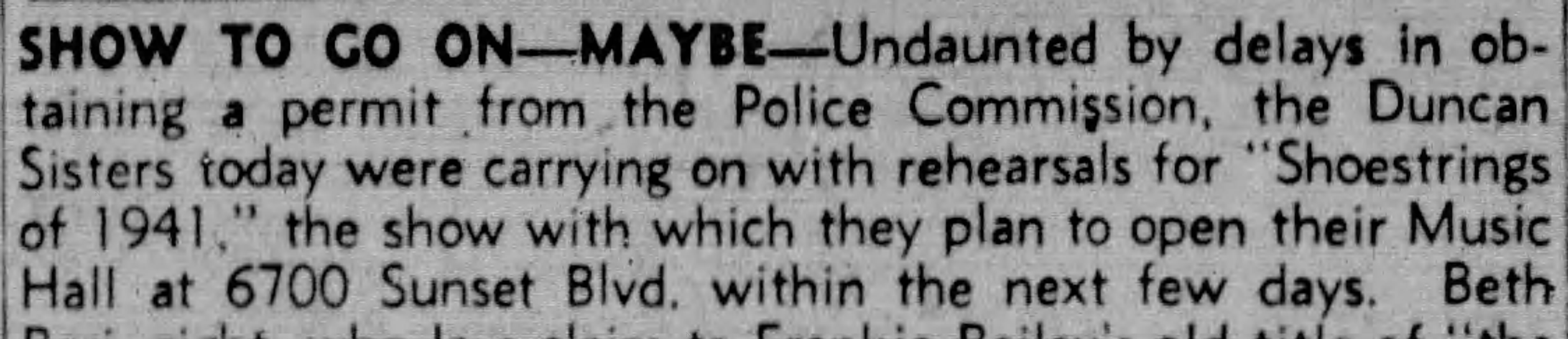 The sisters did not give up without a fight.They went on with rehearsals for the opening night show- which they insisted would be December 28. But that date came and went. On January 2, 1941, the Duncans announced the name of a new show that would open their nightclub. The Police Commission reportedly said only the porch of the building was zoned commercial.