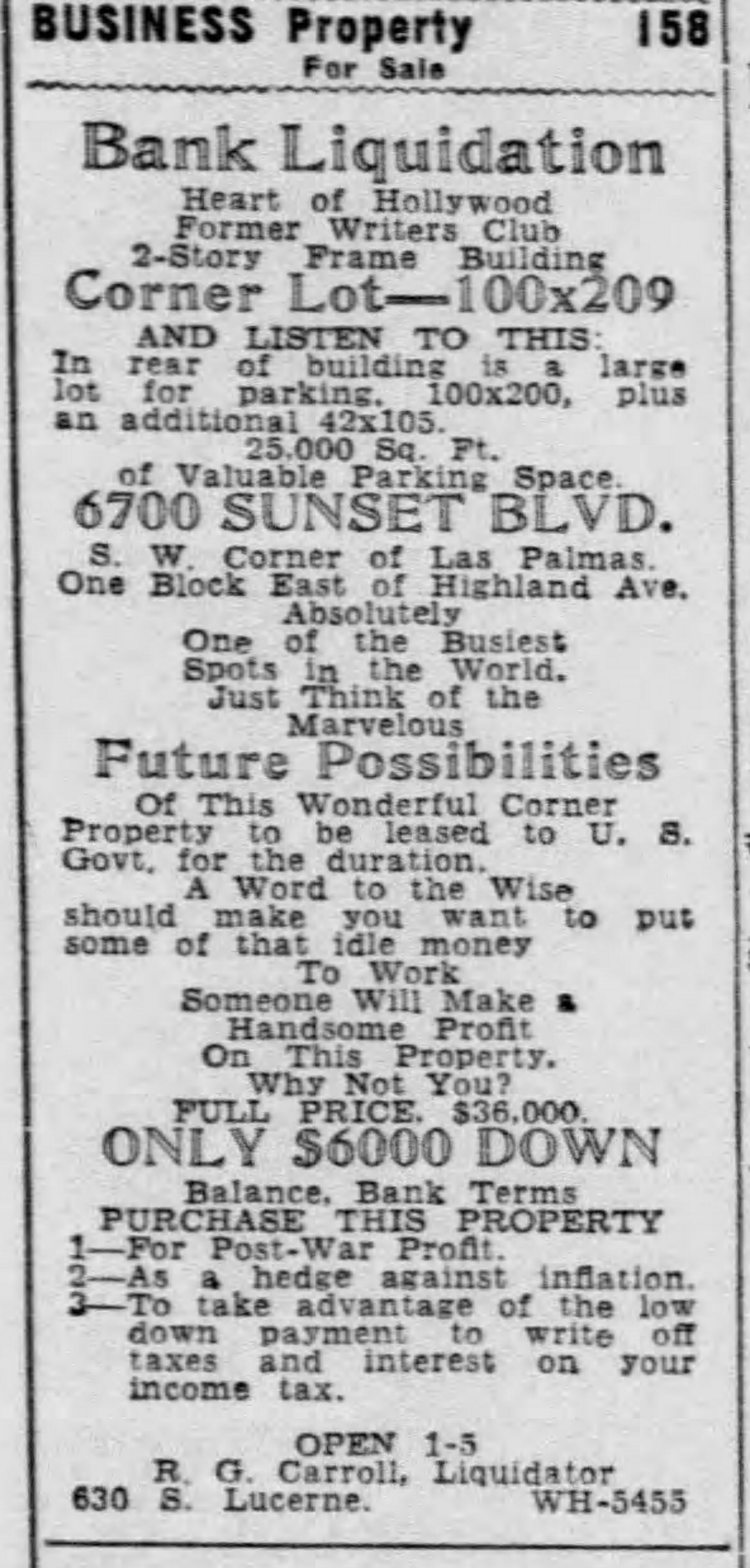 Located at the southwest corner of Sunset and Las Palmas, 6700 Sunset Boulevard was a private residence used by the newly-formed Hollywood Writers Club as their clubhouse from 1921-1937. It has had numerous address and parcel changes, which makes it confusing to research. The following is my own, original research.