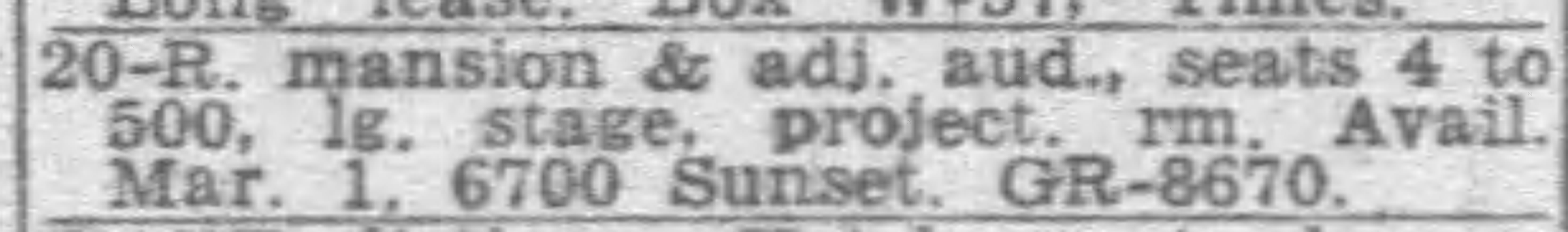 Still for sale in 1943, the vacant building was then in the process of being taken over by the US Military. In March 1944, it opened as “Mom” Anne Lehr’s Hollywood Guild Officers Club. Visiting officers could stay overnight and have a hot dinner and breakfast. It was forced to close on April 4, 1946, its lease having expired. New owner Ernest A. Forssgren advertised the building, with its auditorium space, for lease.
