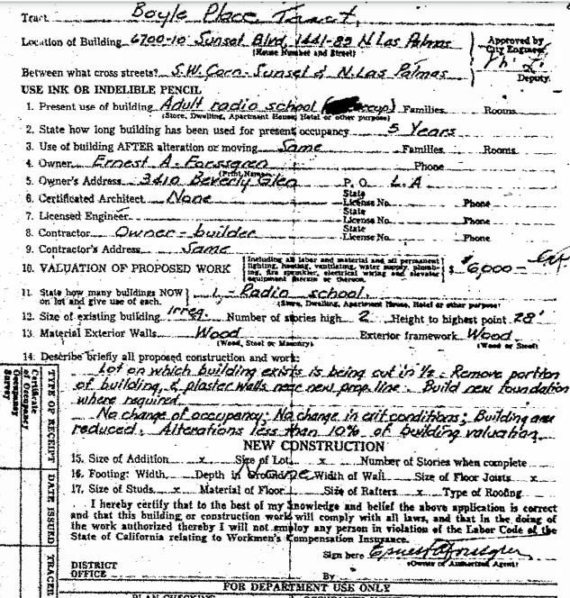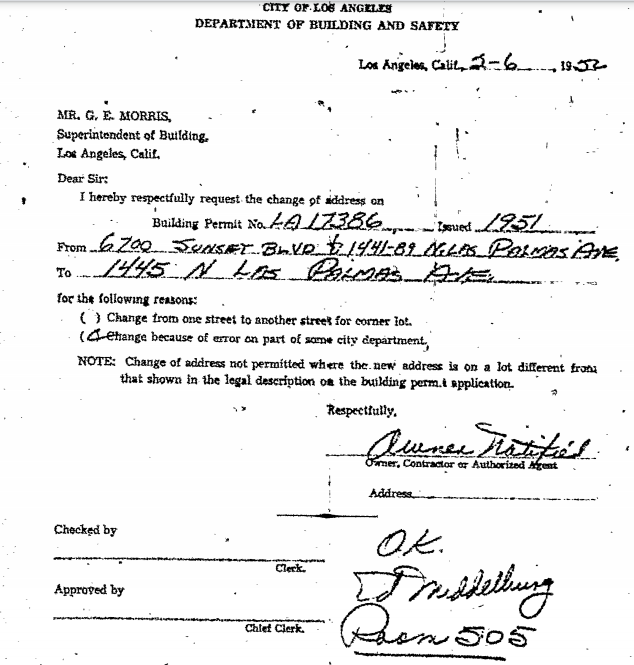 Filed with the permit of 10/9/1951, the permission to changed the building’s address from 6700 Sunset to 1445 N. Las Palmas was granted 2/6/1952.