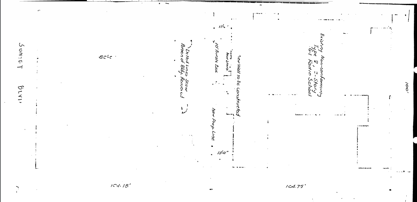 After the mansion was demolished, the newer portion of the building added by the Writer’s Club in 1922 still remained. Alterations were made as necessary for it to be a stand-along building. In October 1951, the deep parcel was cut in half, the theater addition portion sold to the bungalow court next door at 6720 Sunset.