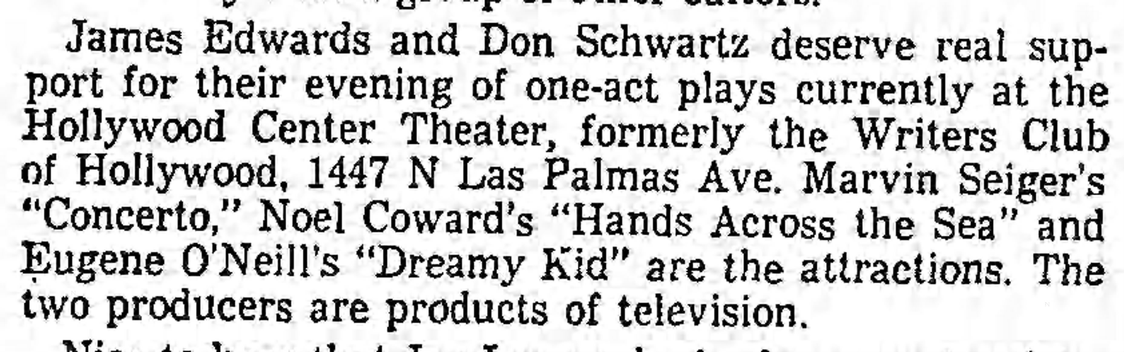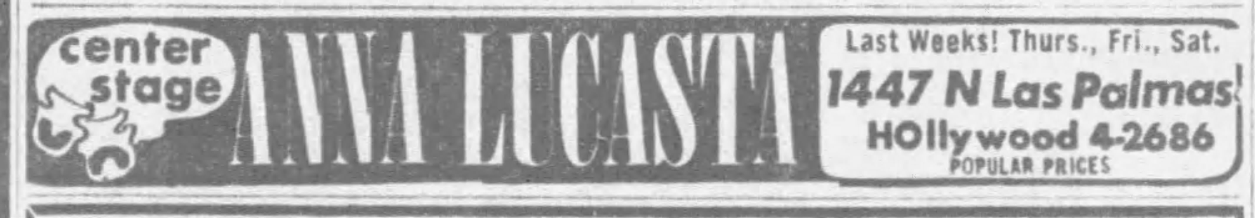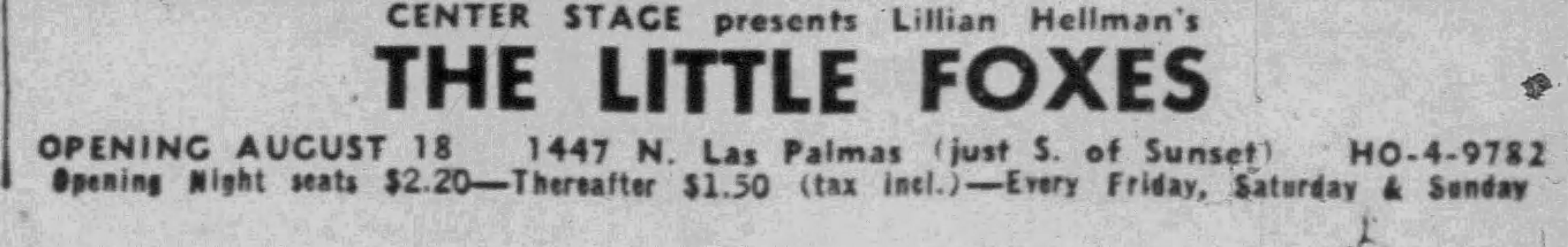 Center Stage’s first production at 1447 N. Las Palmas was The Little Foxes in August 1955. None of the information about the history of the theater was correct. It was NOT built by the Dolly Sisters. The Dollys, Rosie and Jenny, had only come to the USA as girls in 1905 and were on the east coast. As seen above, the theater, when it was still an addition to the Writers Club building, had a brief association with the Duncan Sisters. And it was the original mansion that was built c. 1905, not this theater addition. Perhaps it is a case of someone getting details confused, as is often the case with Hollywood buildings.