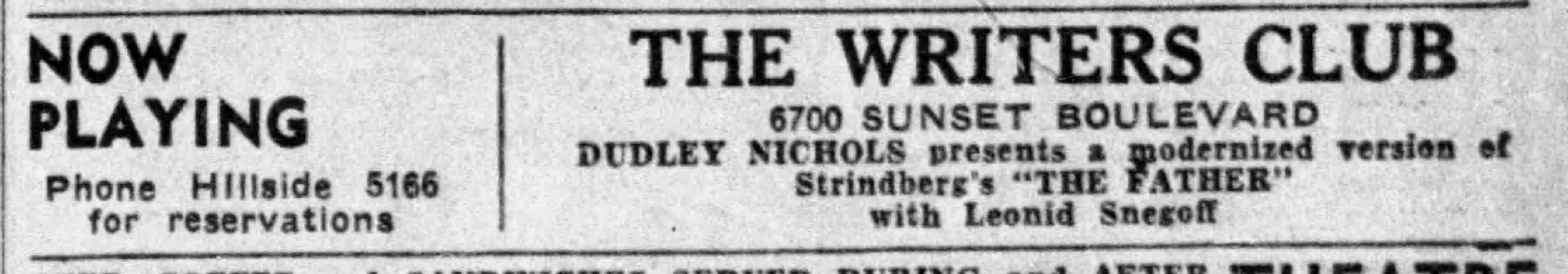 Performances at the Writers Club playhouse were usually for members only but occasionally the public was admitted. The auditorium and banquet hall could also be used by other clubs. 8/4/1934. LAT.