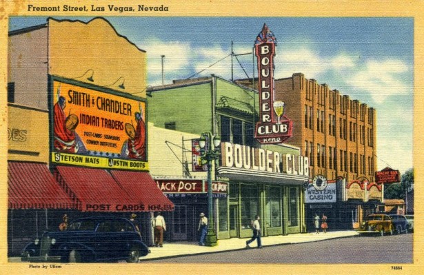 The 100 block of Fremont Street, Las Vegas, c. 1943. Note the real Smith & Chandler Indian Traders storefront.