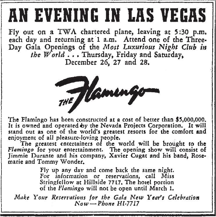 Sep 10 Hedda Hopper’s column mentions a huge nightclub under construction in Las Vegas with Bugsy’s backing, to be called the Flamingo, with 4 swimming pools, to be opened in November, noting how our returning veterans “can’t even get a shed for shelter.”