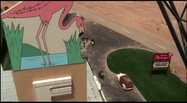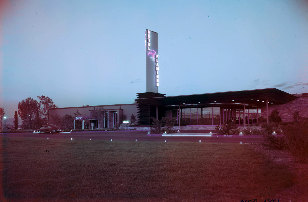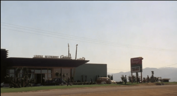 The filmmakers did a great job recreating 1946’s Flamingo casino building (the seperate hotel structure isn’t shown). The Flamingo vertical sign, however, capped by a neon Flamingo, is not the signage that existed in Siegel’s lifetime. It is actually the second sign, added circa 1948-1949. The original sign, shown below, was a pylon with neon on either side. The highway frontage sign also appears to be one that was added later c. 1948-1949.
