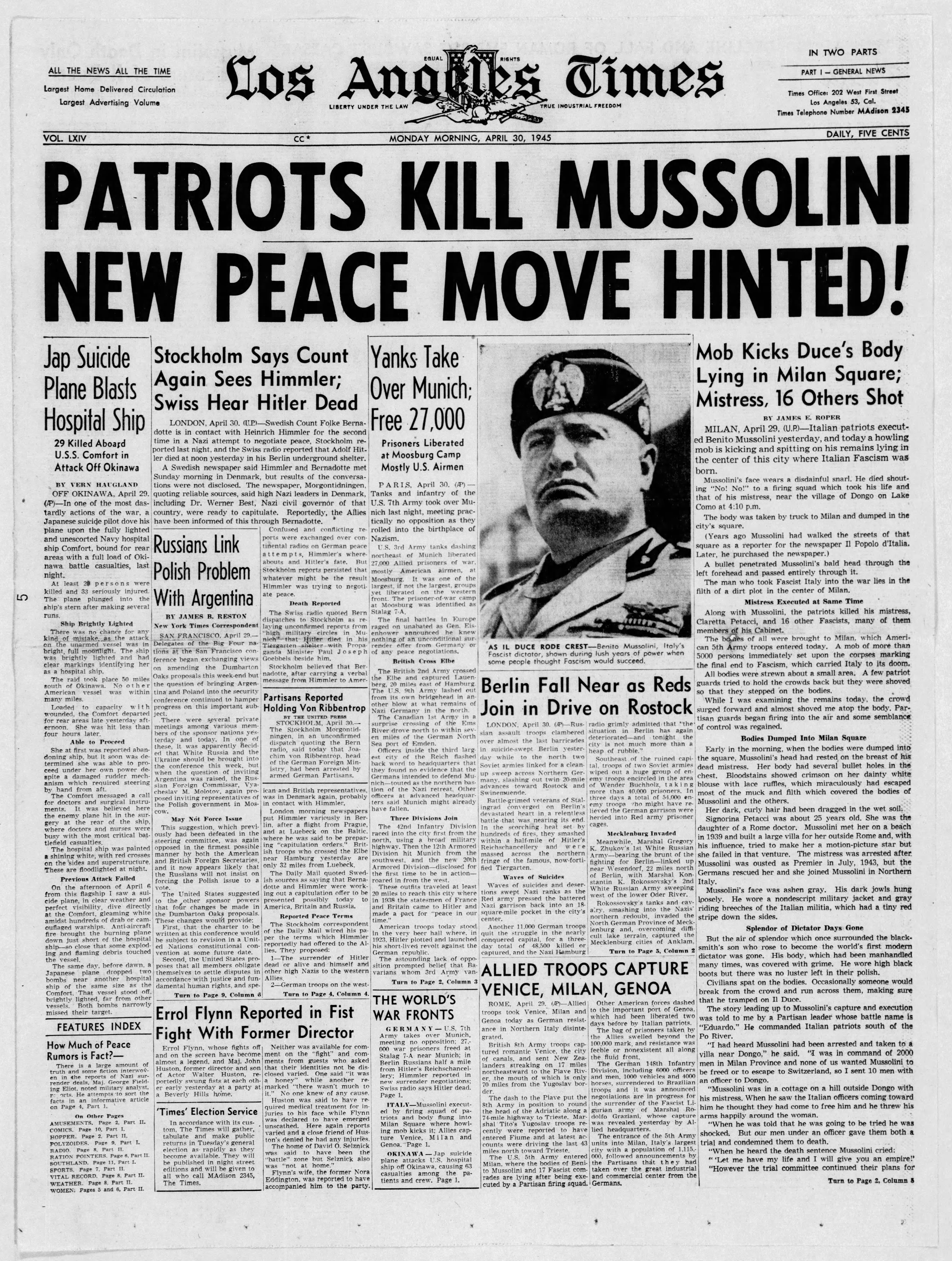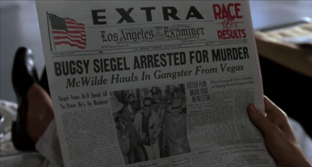 In this scene, Siegel is reading the LA Times newspaper about the murder of Italian dictator, Beinito Mussolini, which occurred on April 28, 1945. The headline and photo have been changed, but the paper shown in the film is the actual LA Times front page from April 30, 1945. The adjacent stories are actual articles published that day.