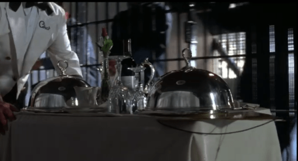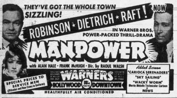 They drive to the studio (presumably Warner Brothers in Burbank) where George is filming the movie Manpower with Marlene Dietrich. Manpower, which also starred Edward G. Robinson, was a real movie, release in Los Angeles in July 1941. Siegel meets Virginia Hill on the set in 1991’s Bugsy. Hill does have a bit part in the film. She plays a hatcheck girl and is costumed in a black uniform, not a fancy gown like Annette Benning’s Virginia Hill wears in Bugsy.