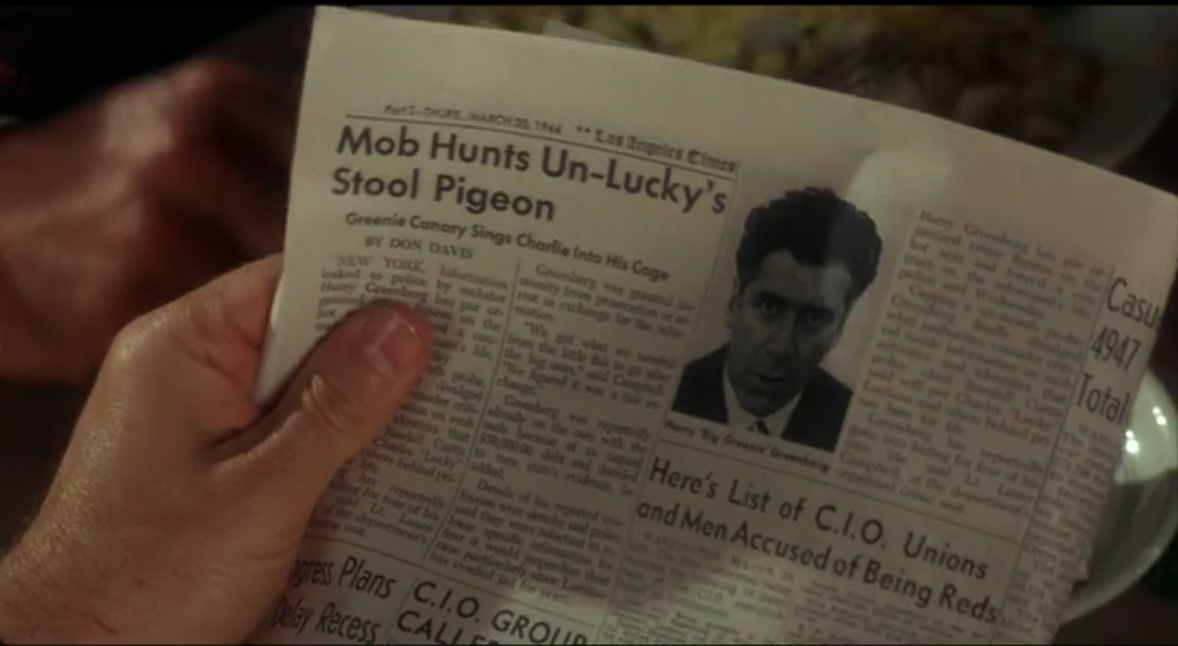 As the film continues, Siegel and Cohen are seen at Union Station with Siegel departing for New York to “visit” Esta and ask for a divorce. Cohen is reading the LA Times, a headline story about “Un-lucky” Luciano and stoolie Harry Greenberg. “Greenie canery sings Charlie into his cage.” The date reads March 30, 1944.